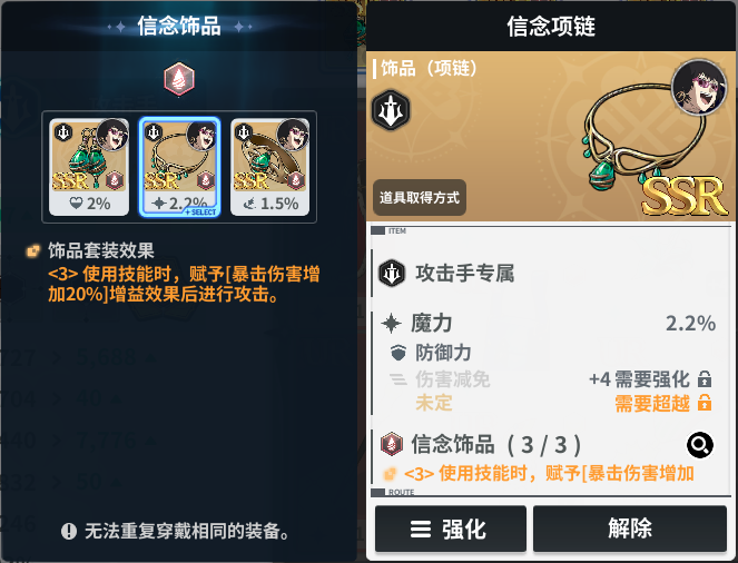 饰品分为「耳环」、「项链」、「戒指」三个类型,当魔导士穿戴的饰品均属于同一套装时,将额外激活饰品套装效果。
