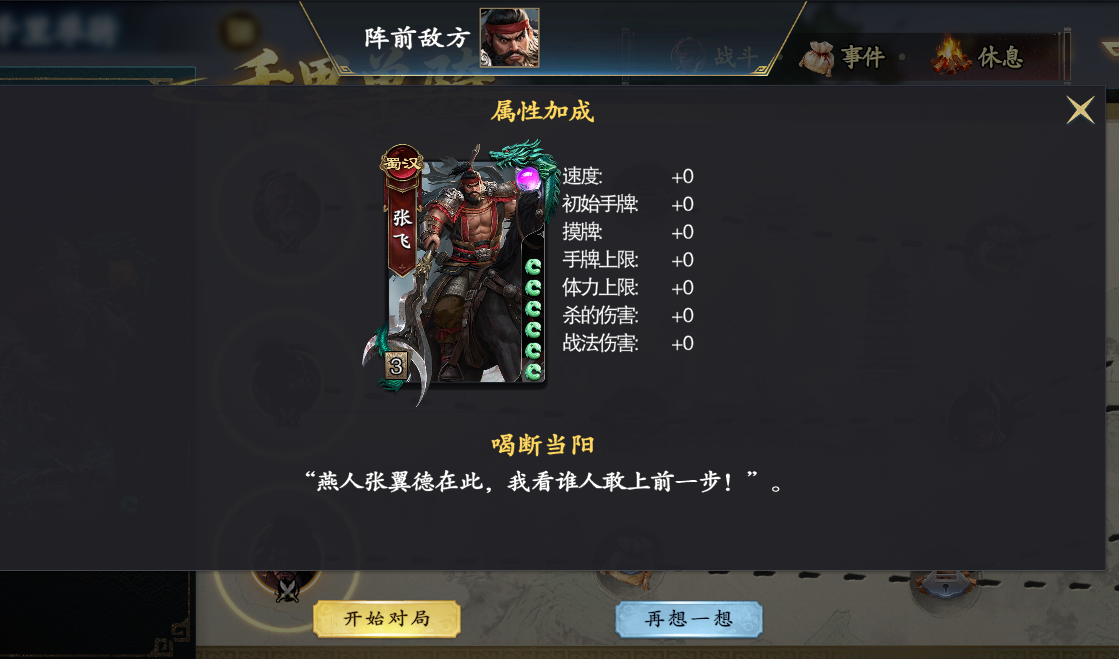 - 休息节点,可以选择回复体力,获得牌或者增强牌堆。(休息结束时有概率获得武将“支援”或者被武将“偷袭”)