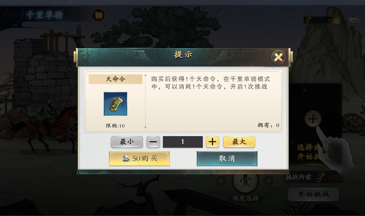 千里单骑是游戏特有的单人闯关玩法,在该模式中,你将体验到当初关羽过五关斩六将的惊险与刺激。每次挑战时会有最大的关卡数,全部通关即可挑战成功。(在该模式中,玩家会拥有独特的PVE属性加成,部分武将会拥有特色的“羁绊”系统)