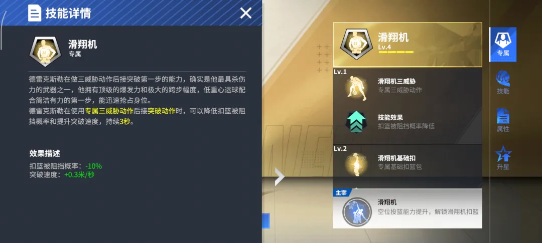 优化3级专属效果:基础扣篮抗盖帽+5%,每得分一次,可以继续叠加,上限25%。