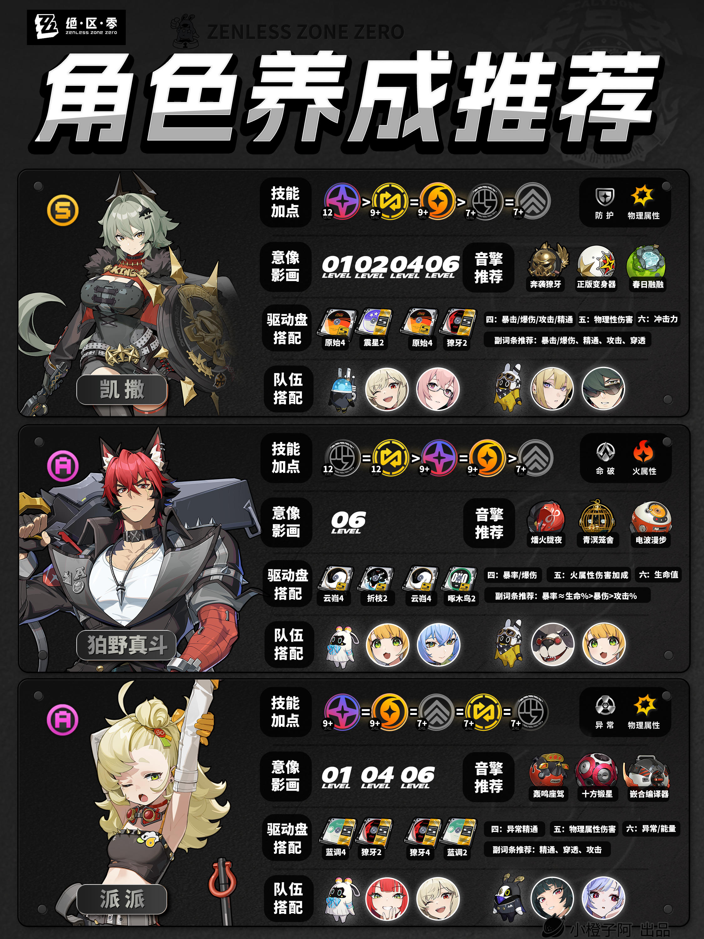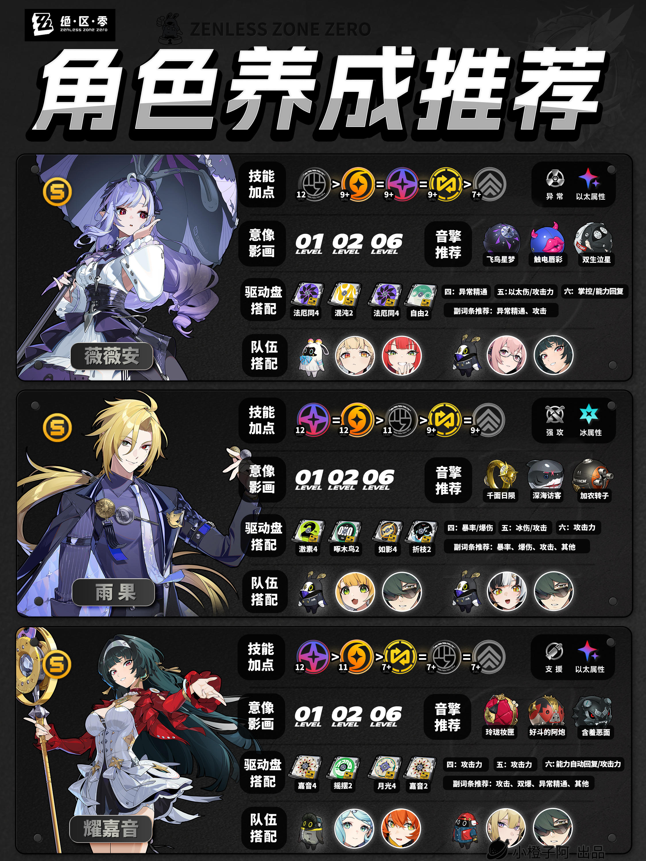 再就是一点,由于图片大小的限制,橙子每次是把角色配队更新到最新角色的组队情况,但并不代表角色只能有这两个配队,比如支援角色【丽娜】,丽娜可以加入绝区零大多数的队伍,而不仅限于下方展现的两种配队情况。