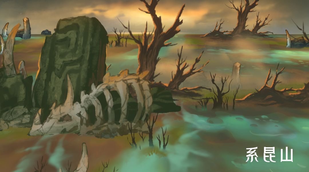 系昆山是被疫毒啃噬的死寂荒丘,是疫灾的终极源头。相柳残血淌出的污流从山中央凹地漫开:那覆着暗绿腐苔、堆着骨状残石的地方,正是相柳尸骸沉埋处;周遭焦黑的枯树、林立的石笋,全是毒血熔蚀的山体余烬。毒脉顺着龟裂地缝缠遍整座山,裹着污流扎进黄河。污流撞上浑黄河水,翻起了灰绿浮沫,毒腥气随着水浪遍布了整片地图。