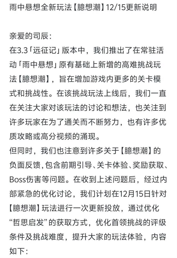 近期,《重返未来:1999》3.3版本“远征记”推出的高难替代玩法“臆想潮”,因机制、难度、奖励等多重设计问题引发大量玩家吐槽,官方已宣布将于12月15日进行优化调整。该玩法替代原“翻覆之舟”,核心为计分制BOSS战,需分表象、里象两队挑战且两队心相不可重复使用,战斗流程包含多阶段机制与词条选择。玩家集中反馈的槽点涵盖多个方面:机制理解成本高,显梦、隐梦等专有名词缺乏清晰引导;怪物数值膨胀,低塑角色难以通关,奶妈角色几乎无效且部分老角色被针对;奖励与buff获取形成死循环,需高分解锁buff但无buff难以冲分;表里关卡需连打,失误需从头重开,单局耗时过长。官方回应将优化“哲思启发”系统,新增无需前置战斗的高强度增益,同时调整挑战难度,以改善玩家体验。