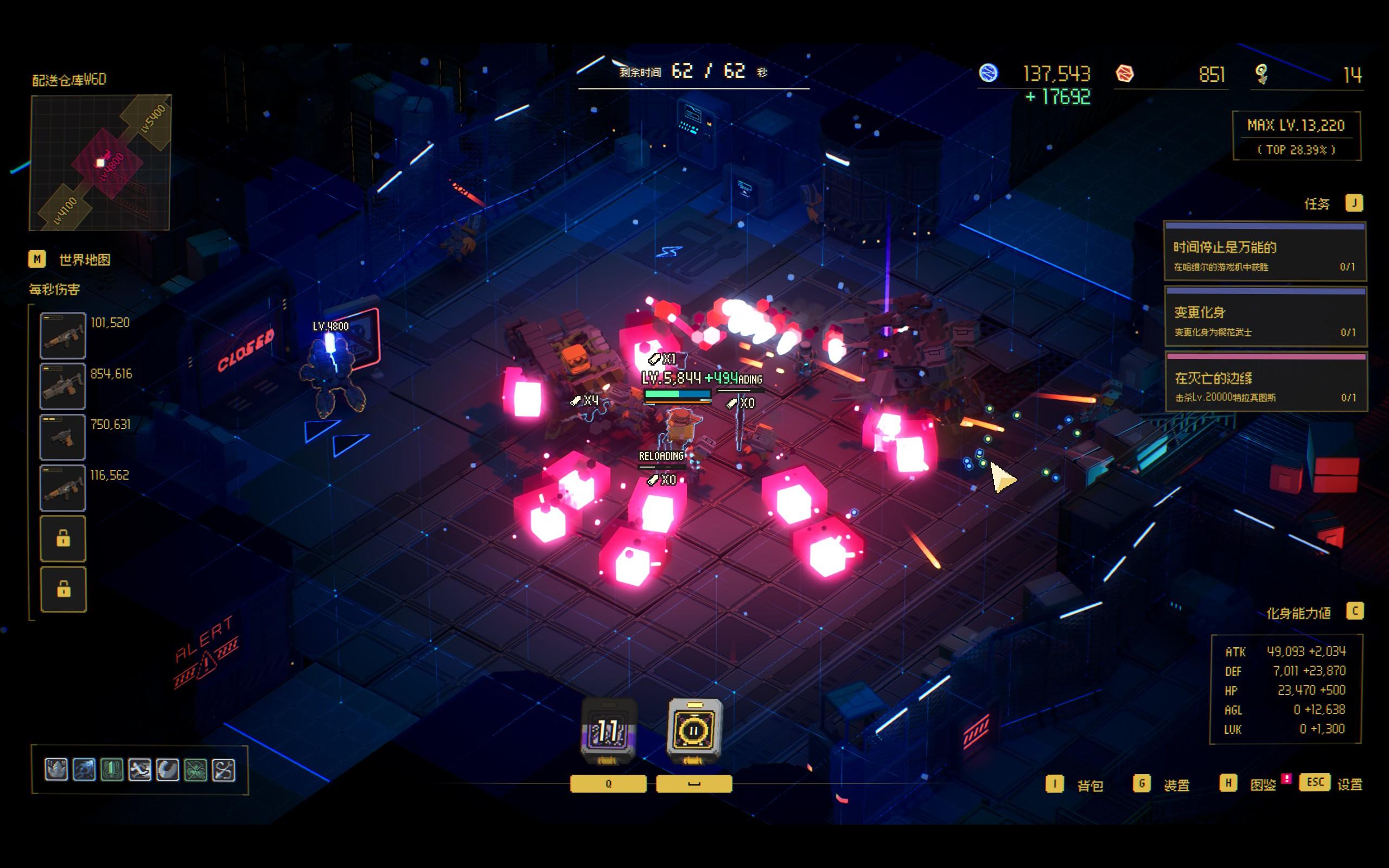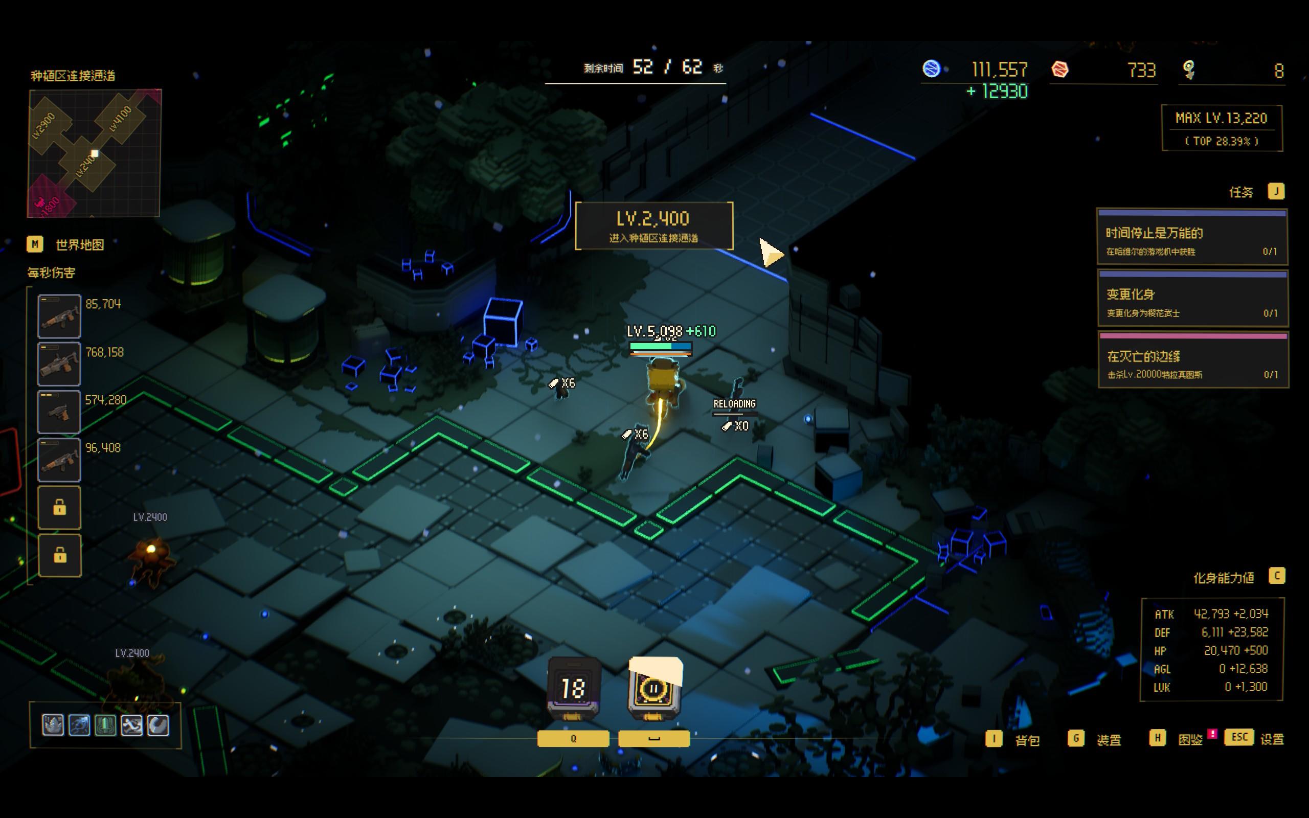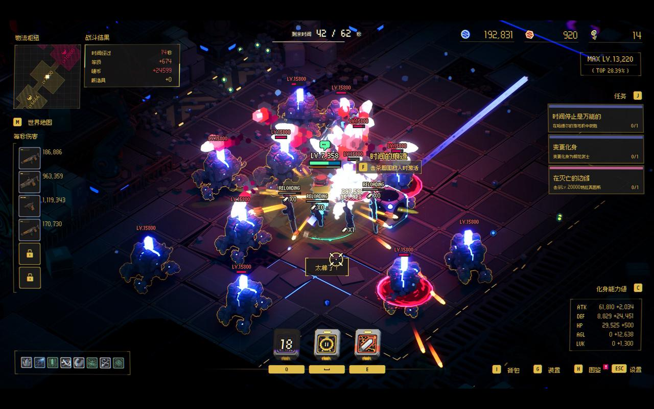 游戏时间延长机制也很巧妙。时间在逐渐归零,但只要你击杀敌人,捡芯片构筑升级,就能让30s的倒计时不断补上,并且不断延续,并且有时候还能提升这个倒计时的上限。(其实这个倒计时也算种另类的生命值)
