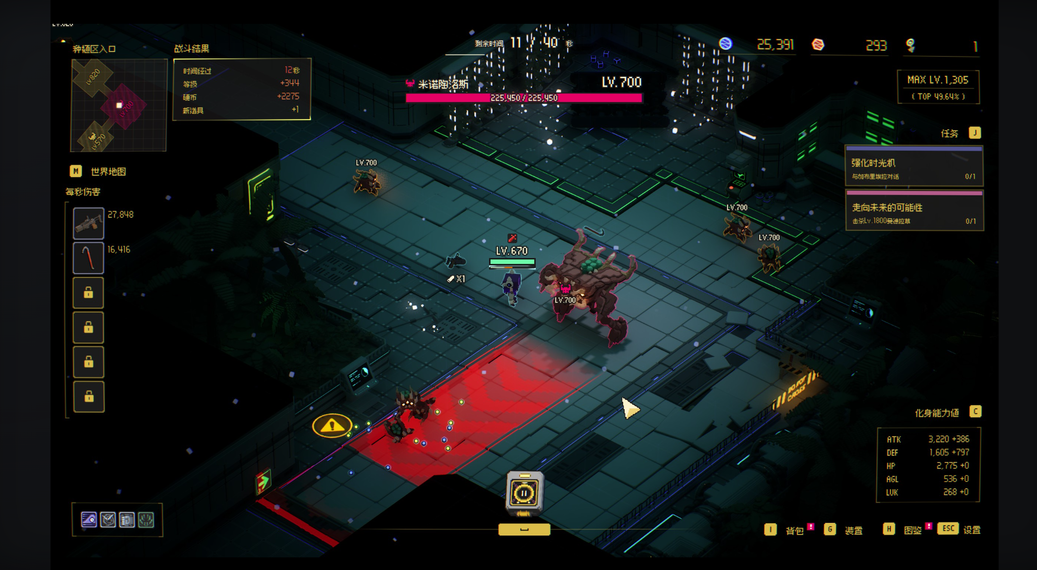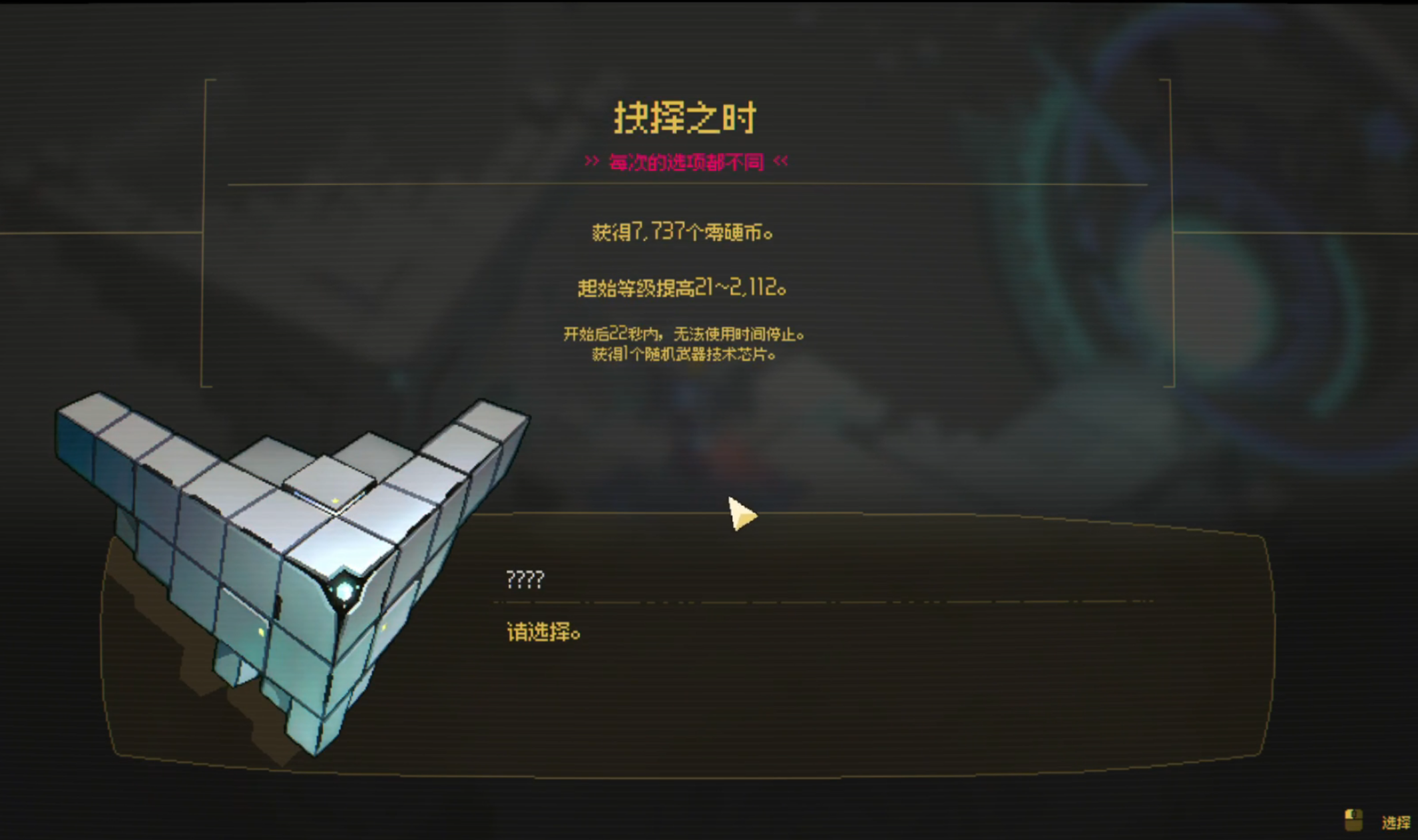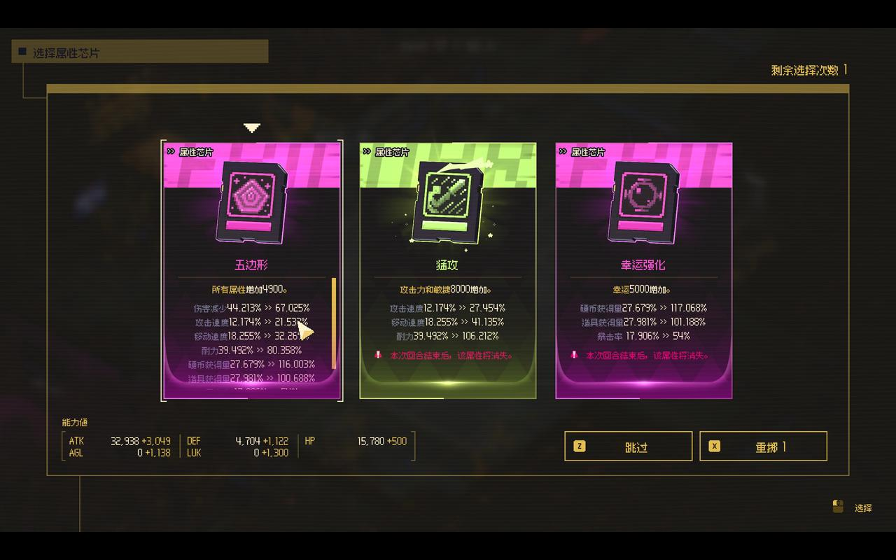 而且游戏开局还有抉择之时,开局时出现的神秘生物会提供额外强化,例如:赠予高品质芯片,提供额外资源,随机提升玩家等级。这个提升非常超标,我好几次天胡开局,就是因为随机提升了等级,直接飙到几百级,前面的小怪完全不够看,我直接灭完boss,冲到最后。
