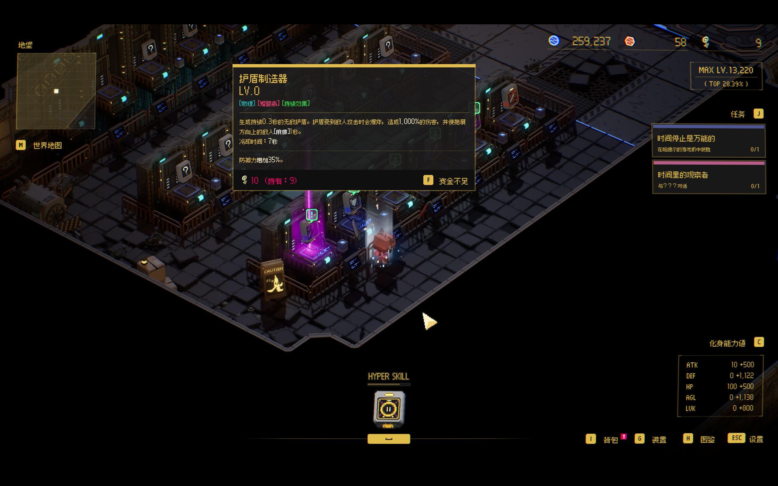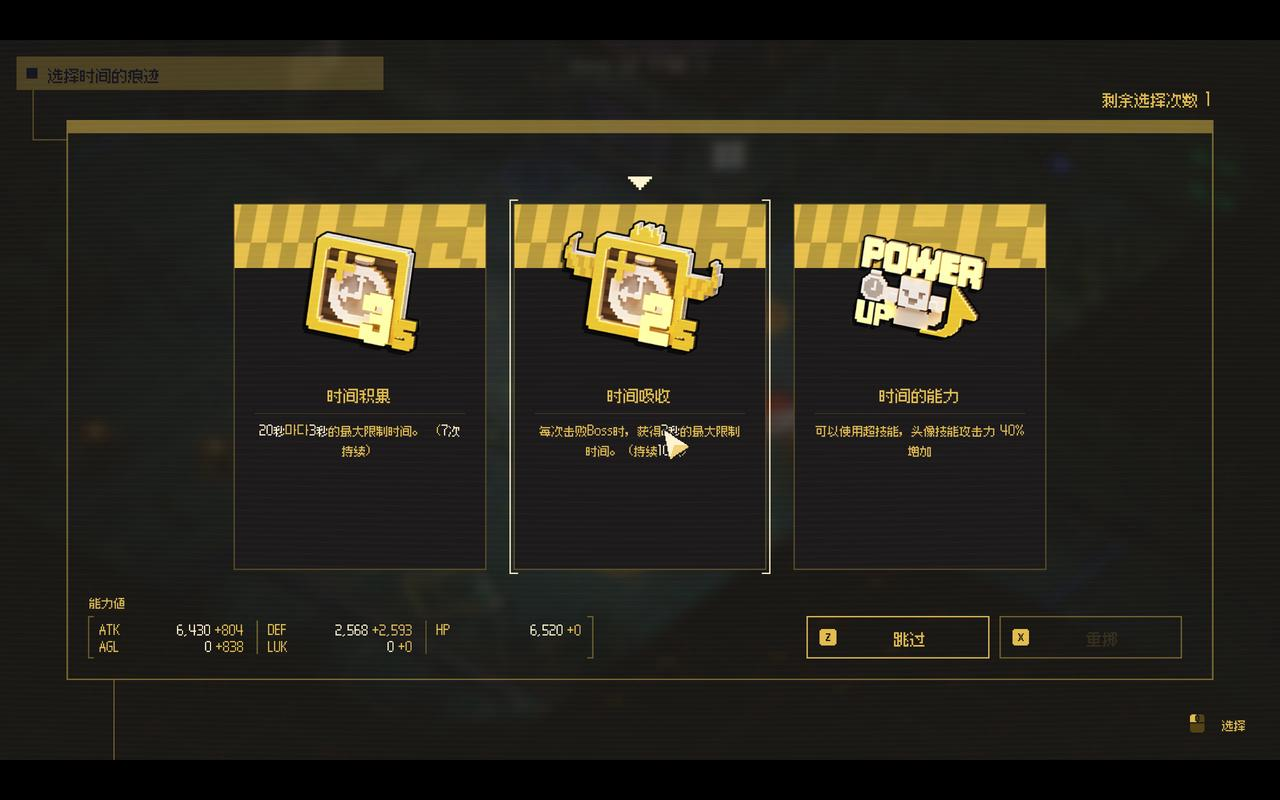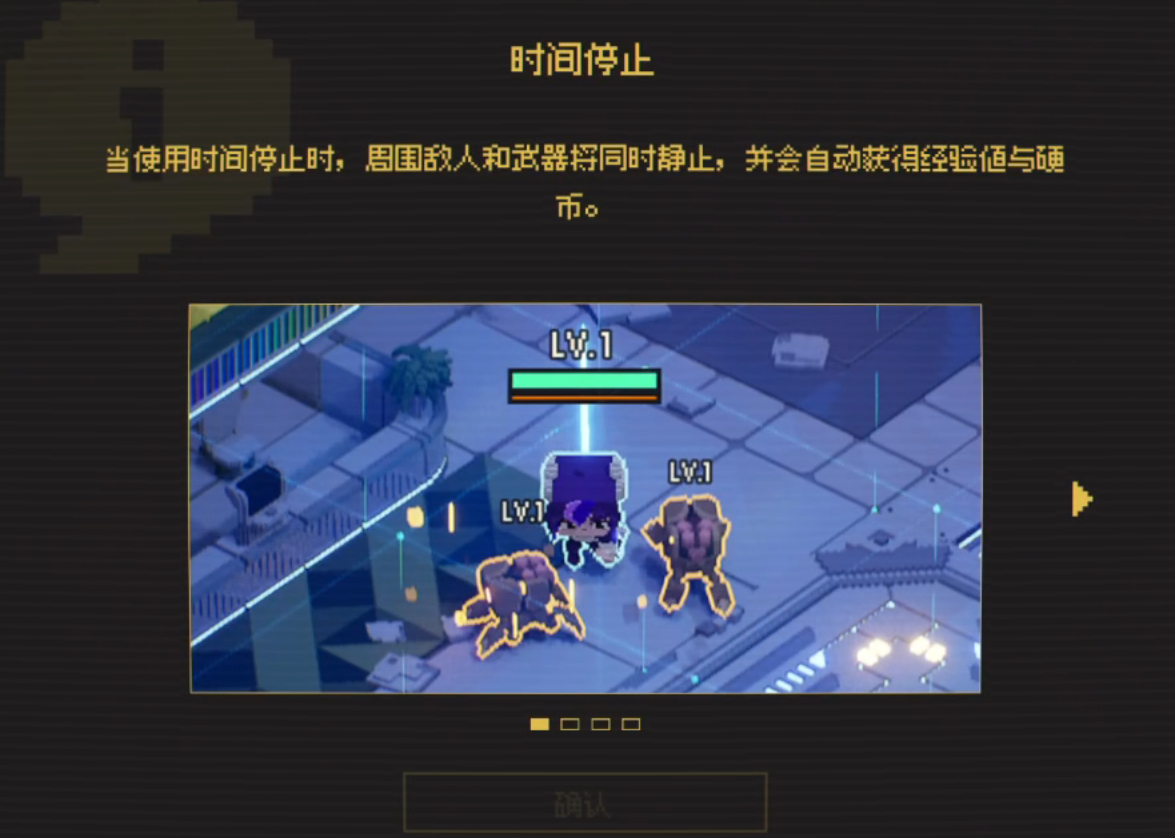 当然,如果它只有倒计时这个时间元素,它也只能算给游戏添加了一种限制。但是它恰恰还有着“时间停止”的设计。当使用时间停止时,自己和敌人都不能攻击,并且持续时间无限,自己可以自由移动,可以捡去击败敌人的硬币和经验值升级。