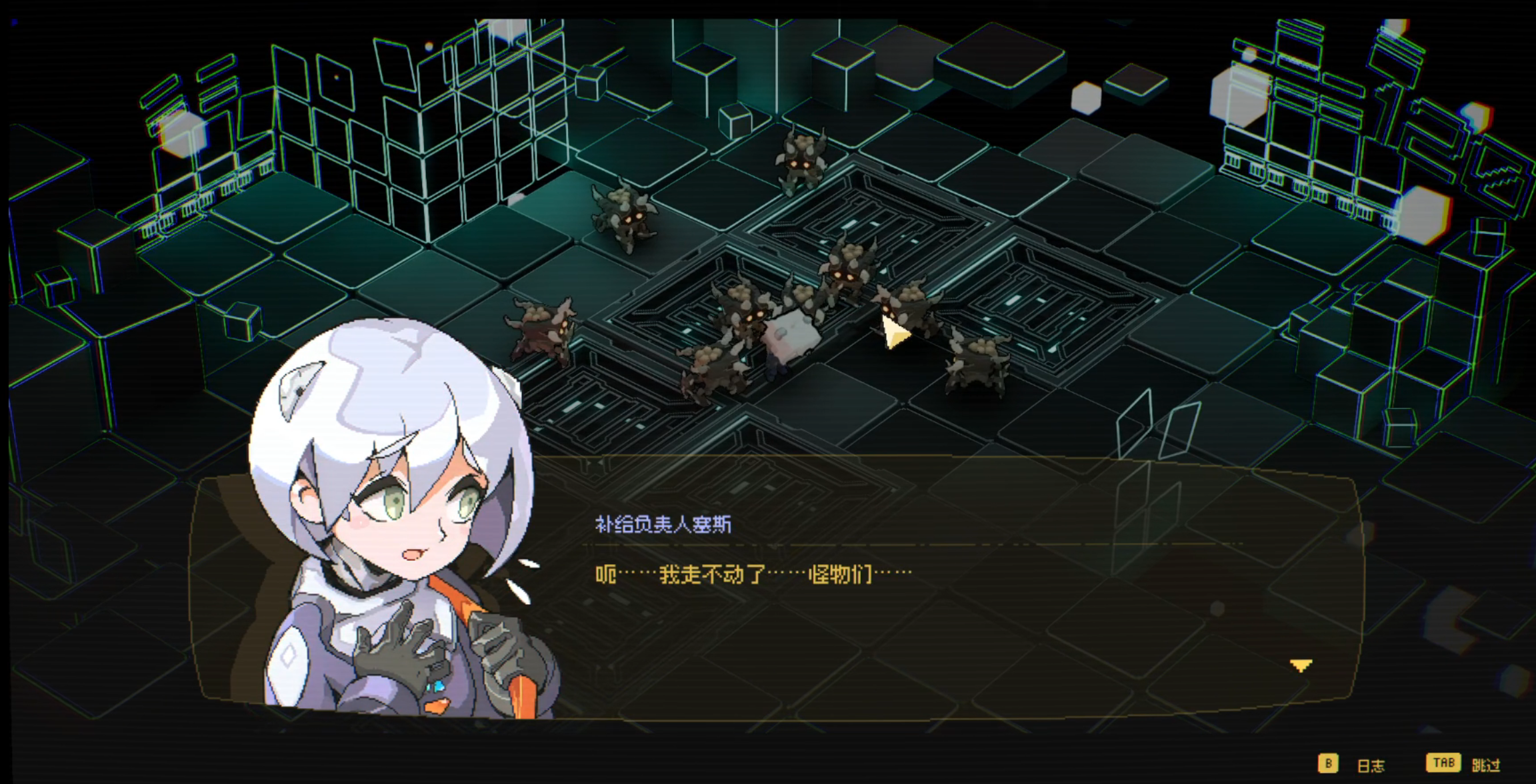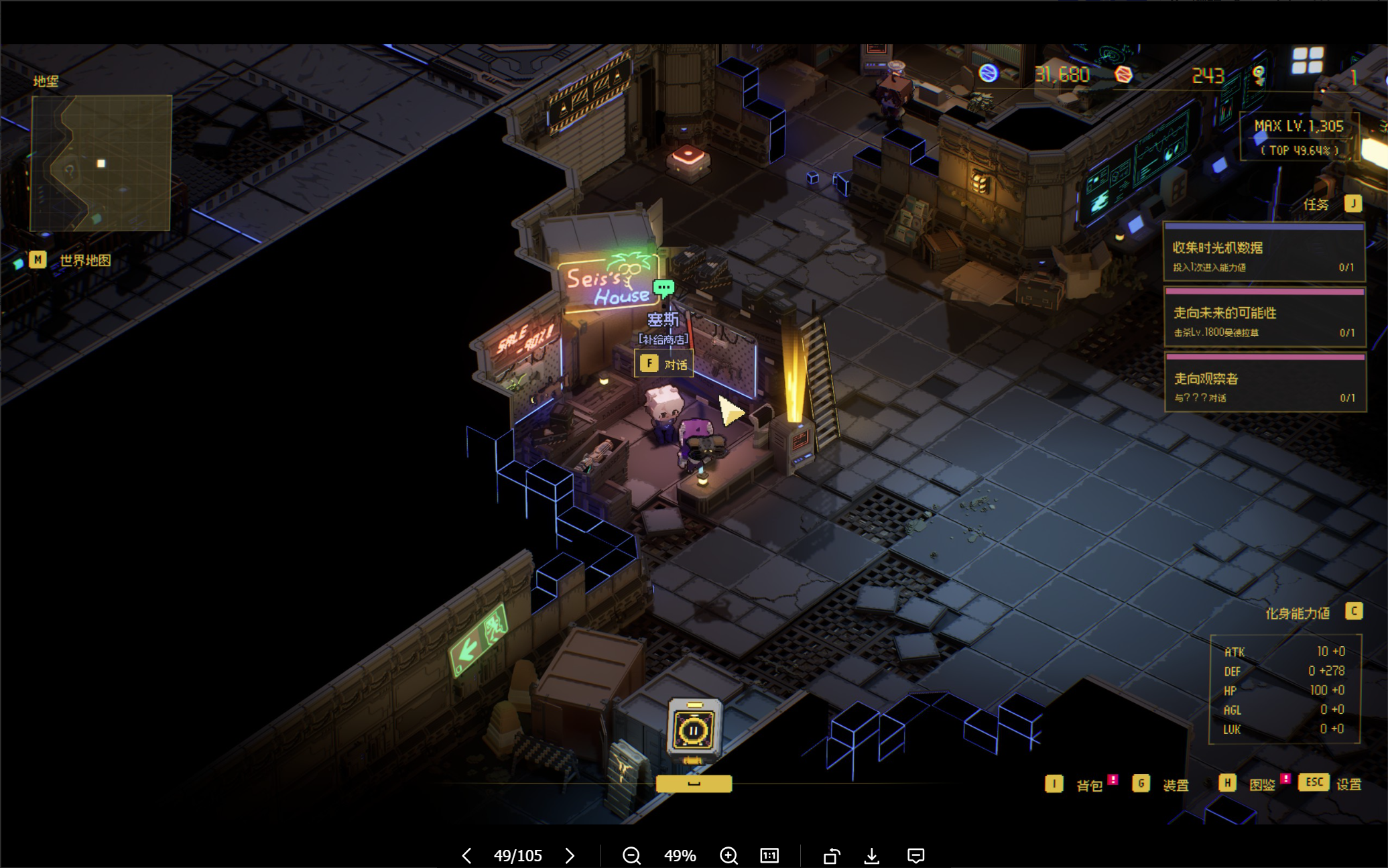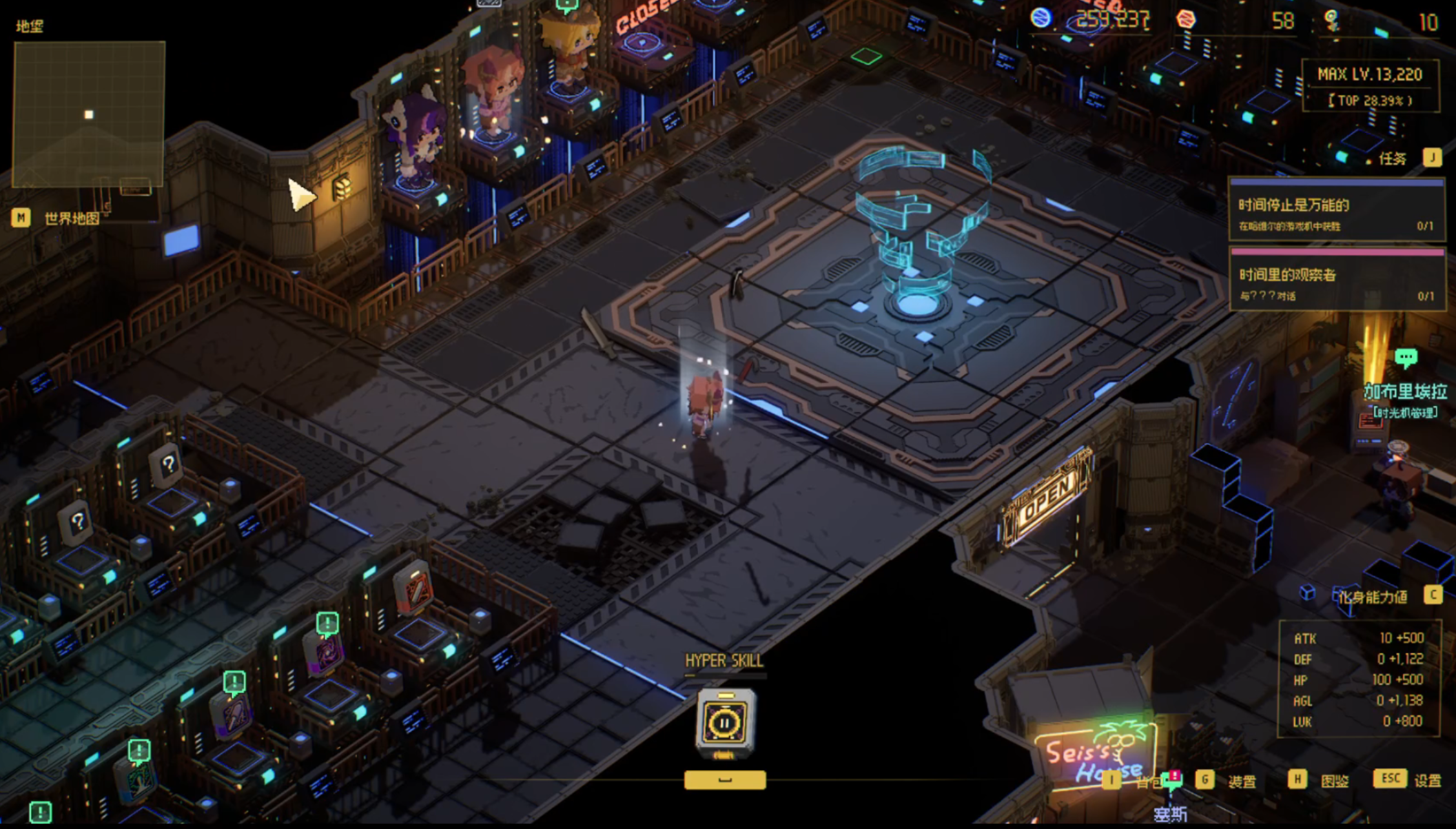 而《零秒:时光的归途》则是一款围绕“时间停止”这个概念设计的动作肉鸽刷宝策略游戏。游戏采用像素风结合二次元立绘的形式,我个人真的很喜欢这种美术风格。各种NPC形象也很讨喜,我们的女主很可爱,还有多种形态的化身可以选择。(角色可以用6个)