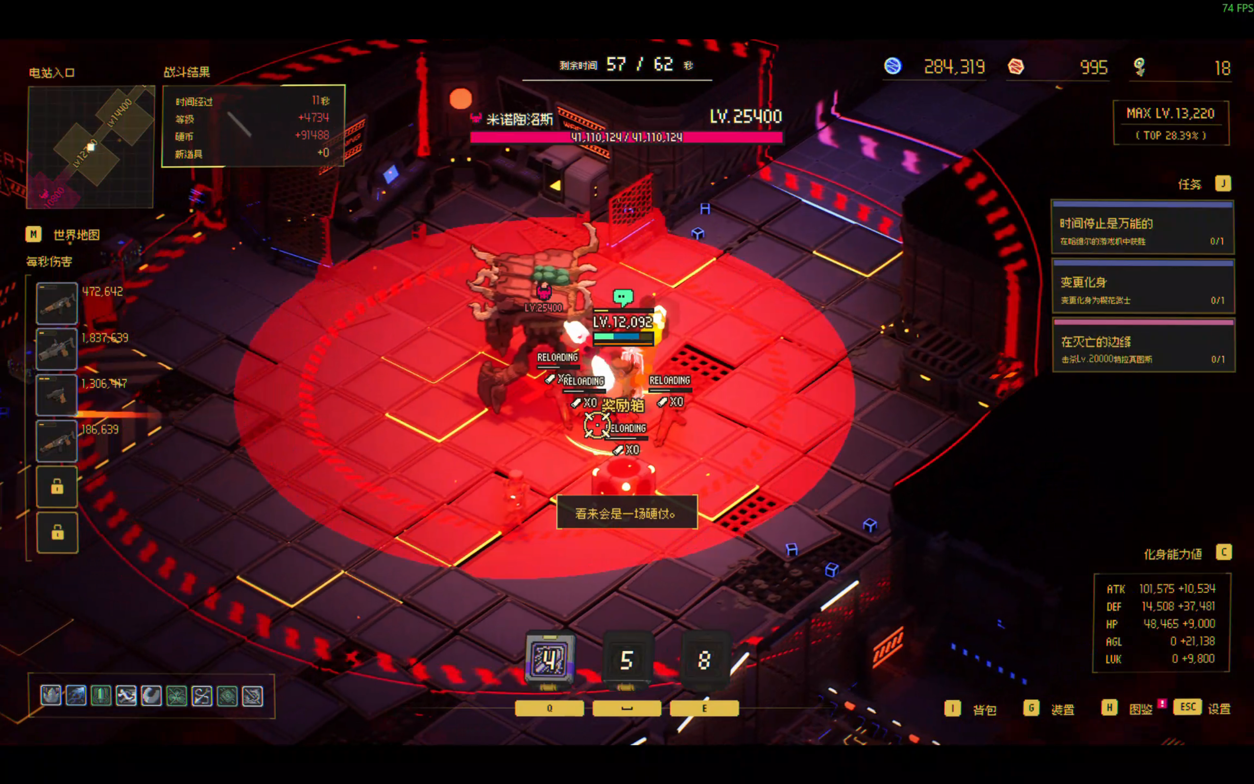也可以利用时停快速躲避强大敌人超高范围的攻击。(图中的丙醇时停已经用过,所以硬吃了一招,大家遇到boss一定要攒好自己的时停能力。)