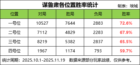从整体统计看,谋鲁肃各位置胜率排序依次是:一号位 > 二号位 > 三号位>四号位。