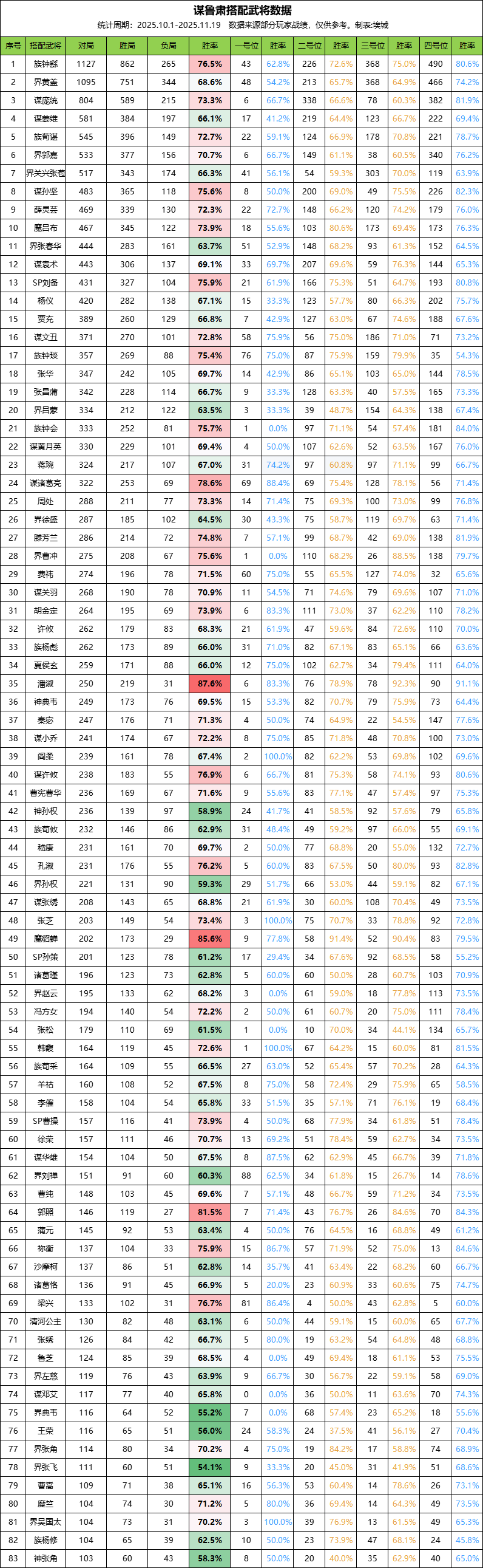 S10-S11赛季共统计到2.78万局谋鲁肃的组阵样本,样本超过百局的组阵有83个,其中胜率超80%的组阵有3个,大于75%的组阵有14个,大于70%的组阵有36个。
