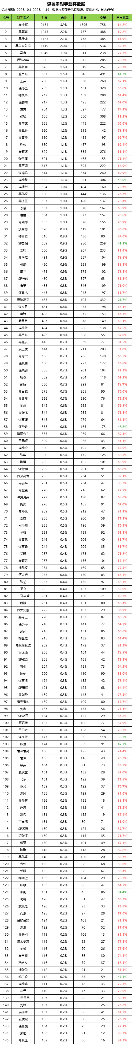 武将胜率跟匹配机制也有很大关系,如果武将评级很高,会更容易遇到强将对手。最后看下谋鲁肃的对手武将数据。样本超过百局的145个对手武将里,谋鲁肃胜率低于50%的仅有9个:谋诸葛亮、谋许攸、祢衡、魔吕布、鲍三娘、陈登、族钟琰、谋华雄、SP刘备。