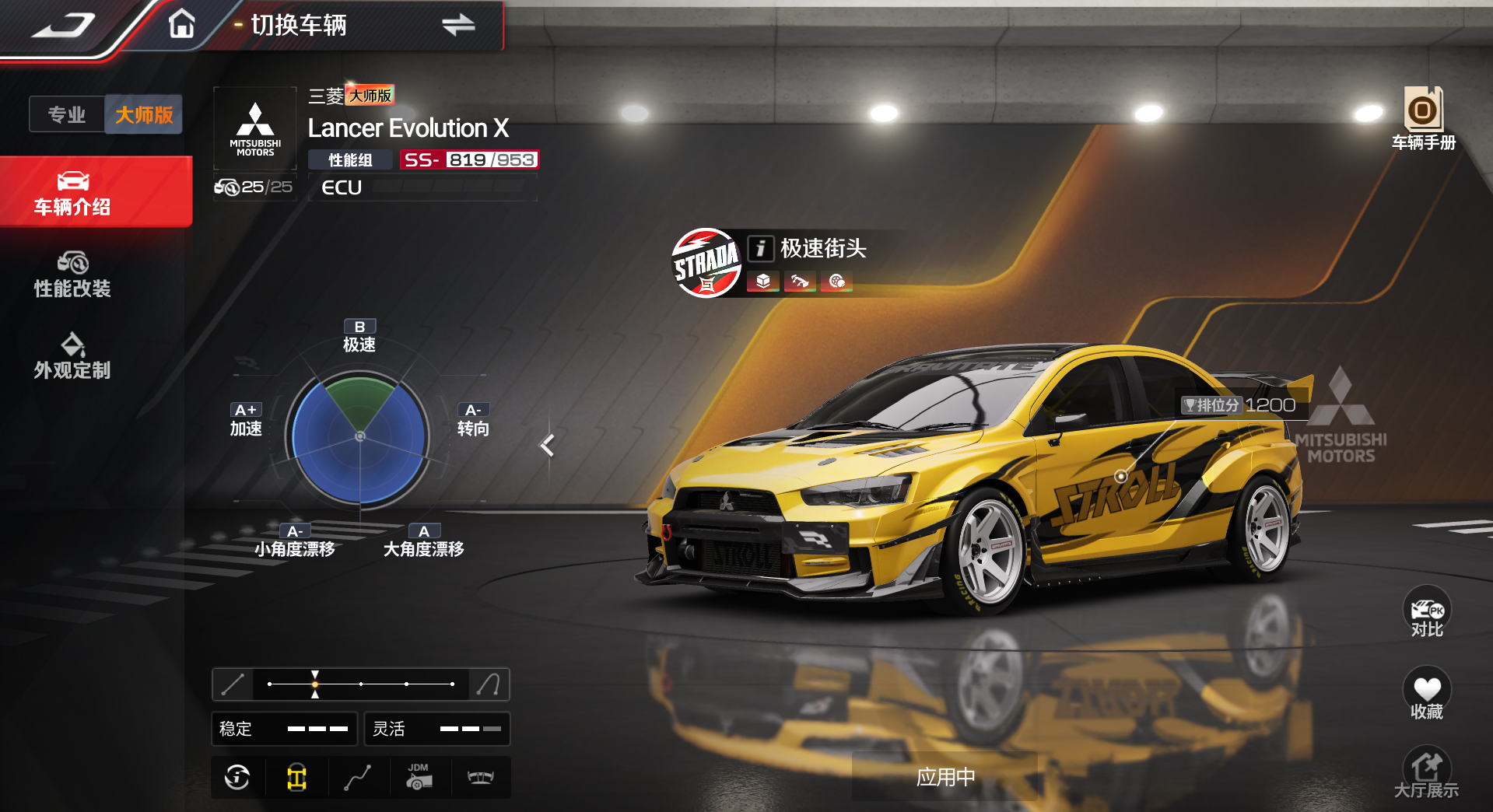 车手们注意啦!三菱 Lancer Evolution X 【专业】和【大师版】车辆共享性能改装——引擎、轮胎、电控、底盘、车身改装等级,不用再消耗零件进行改装啦!车手们可在车辆介绍页面查看和切换模式,在排位模式中,车手们可以选择想要的模式驾驶,两种模式将分别享受独立的排位分数计算哦~