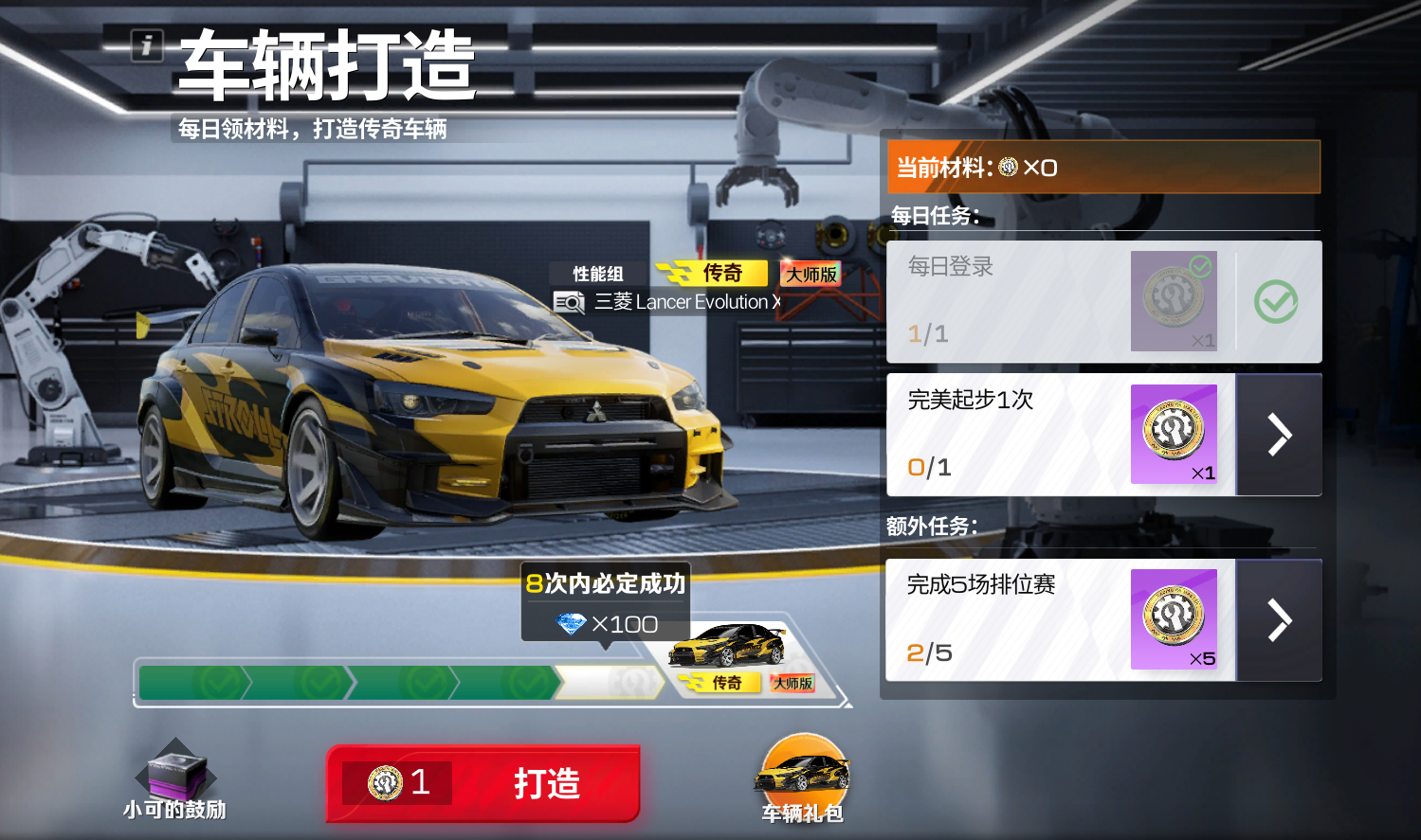 每日上线参与【大师车辆打造】活动,领取材料打造车辆,打造成功就能免费解锁一台三菱 Lancer Evolution X 街头传说 '10,还能顺带拿下钻石、改装零件等奖励!