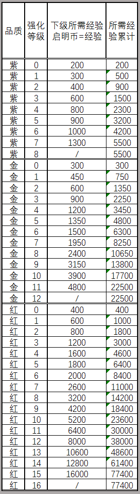 - 同强化等级的紫色、金色、红色藏品所需经验的比值=2:3:4