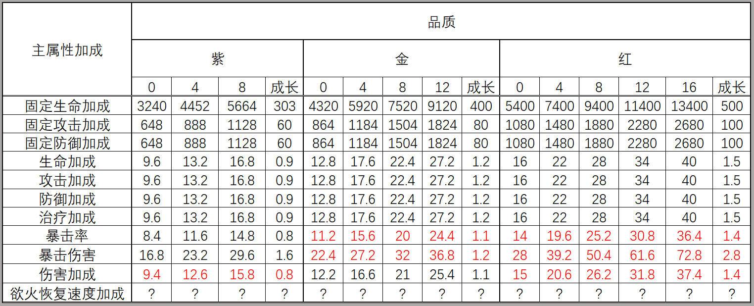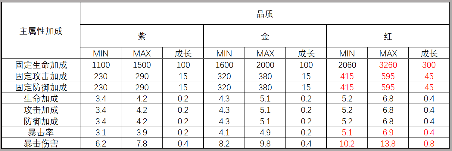 - 同强化等级的紫色、金色、红色藏品主词条属性数值的比值3:4:5