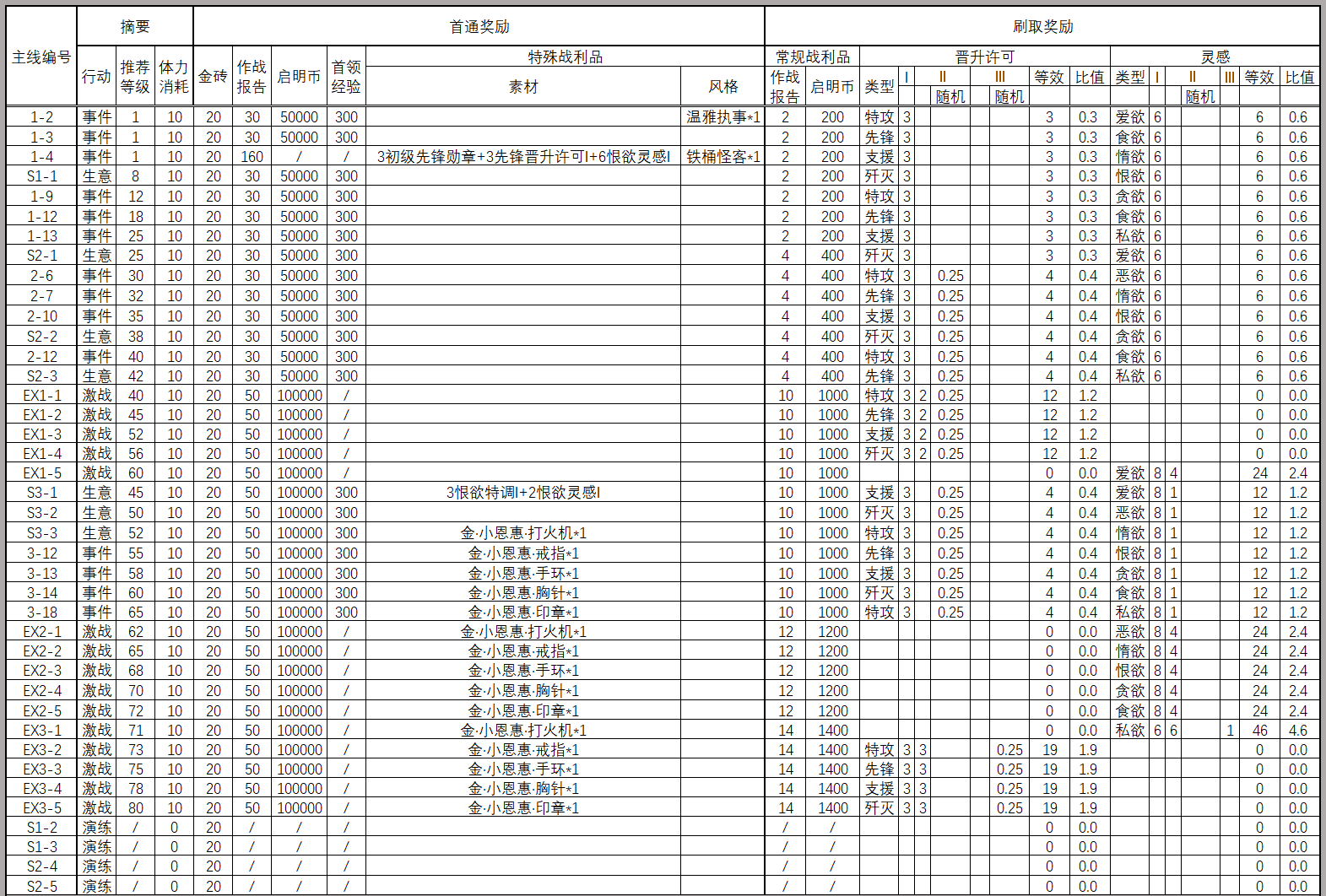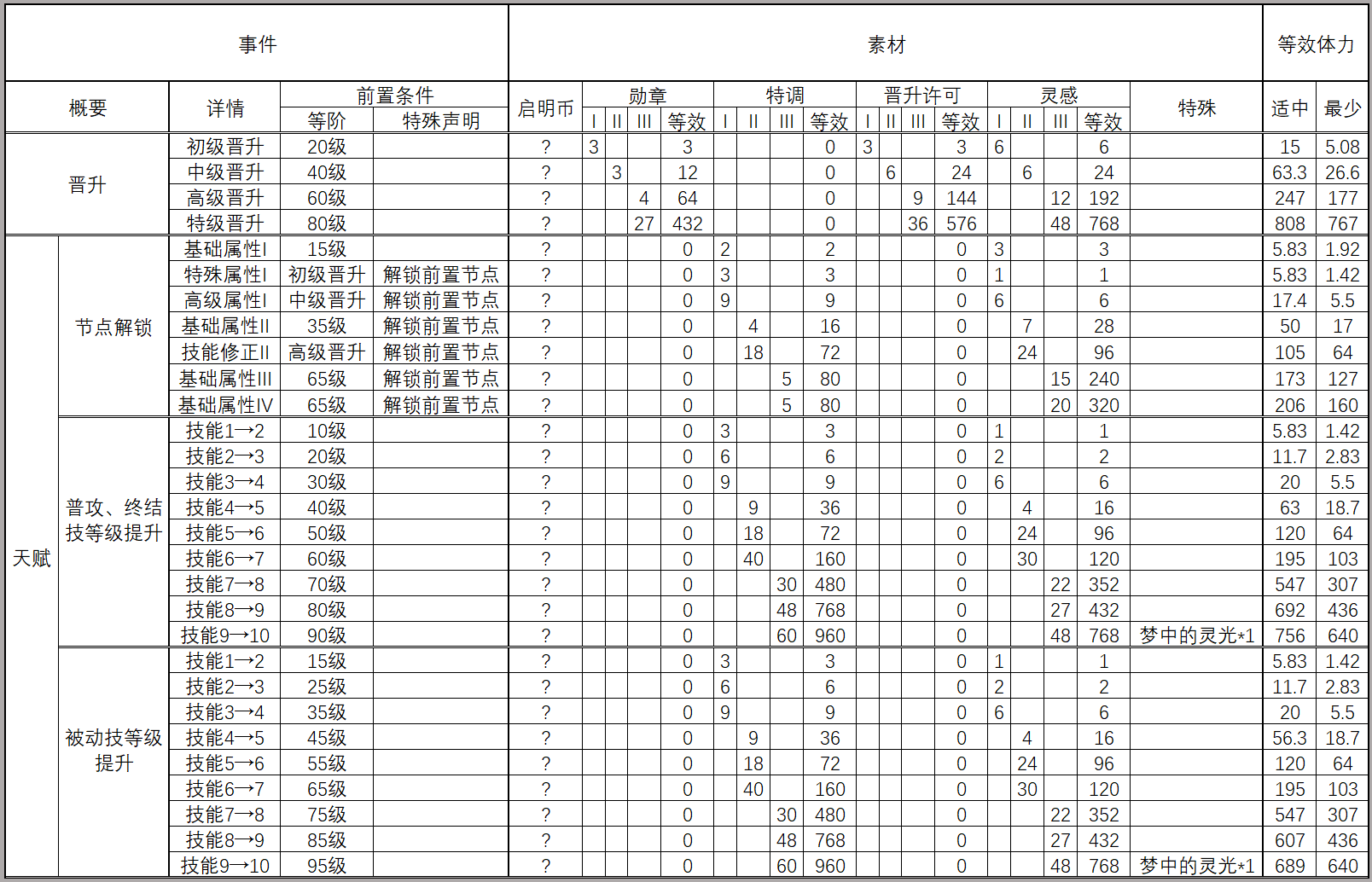 - 适中等效体力代表:和对应晋升、天赋提升解锁时的等级去刷取对应最优关卡(暂不考虑越级超过5级)