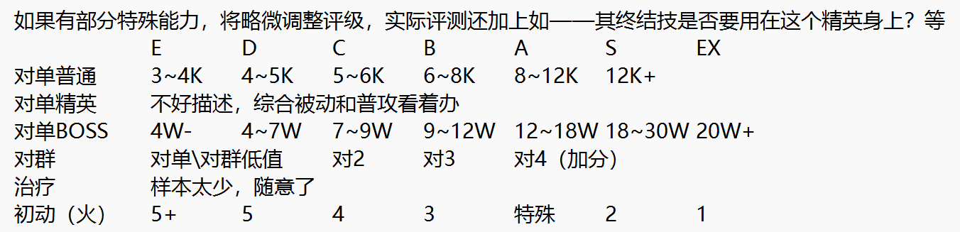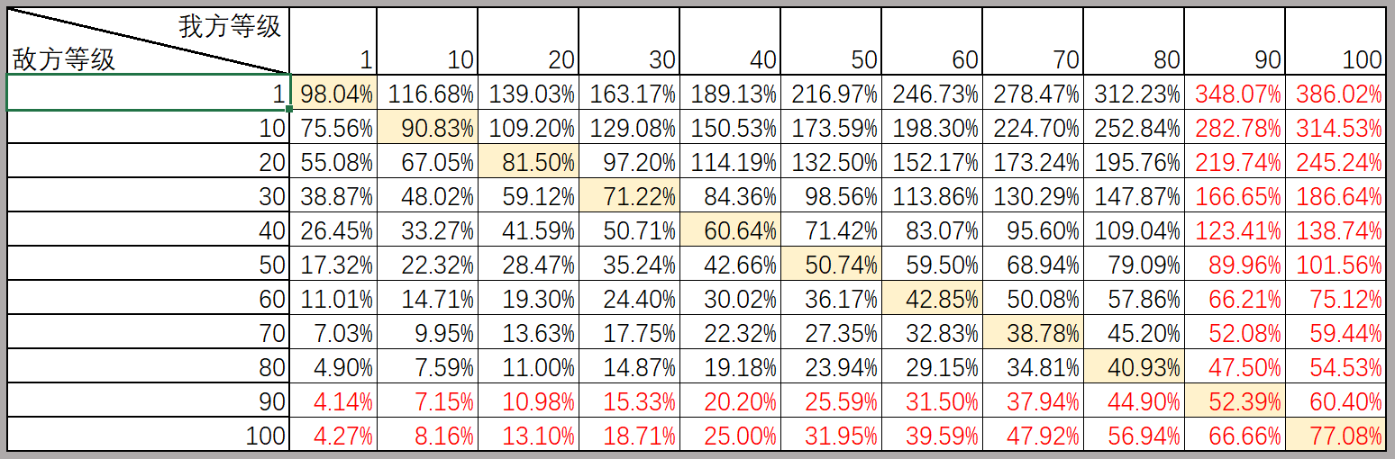 其中,标红的数字代表没有测得足够的数据量,仅为了表格完善度作函数拟合推断,但因数值策划风格多采用取舍导致拟合度都不高,仅供参考(但是误差到不是很大,可见后文《战斗数据计算》解释)