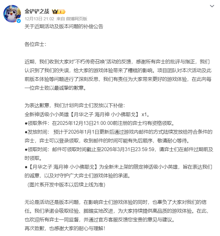 近日,《金铲铲之战》于2025年12月12日凌晨上线的重磅付费活动“不朽传奇召唤”出现严重规则漏洞。部分玩家发现,在抽完奖池中的普通道具后后续抽取能以极低成本(约60元/次)必得神话级或至臻级道具,导致471个账号仅花费约6000元即“氪穿”奖池,获得原本价值约10万元的全套顶级皮肤。官方在活动上线约3小时后紧急将其下架,但最终决定不回收这些异常获得的道具,并试图通过全服补偿平息风波。这一处理方式引发了玩家尤其是重氪玩家的强烈不满![[TapTap表情|TapFamilyxdoro2_粉狗比心]](https://img.tapimg.com/market/images/101c7e3200596fe8e03765080b467fb8.gif)