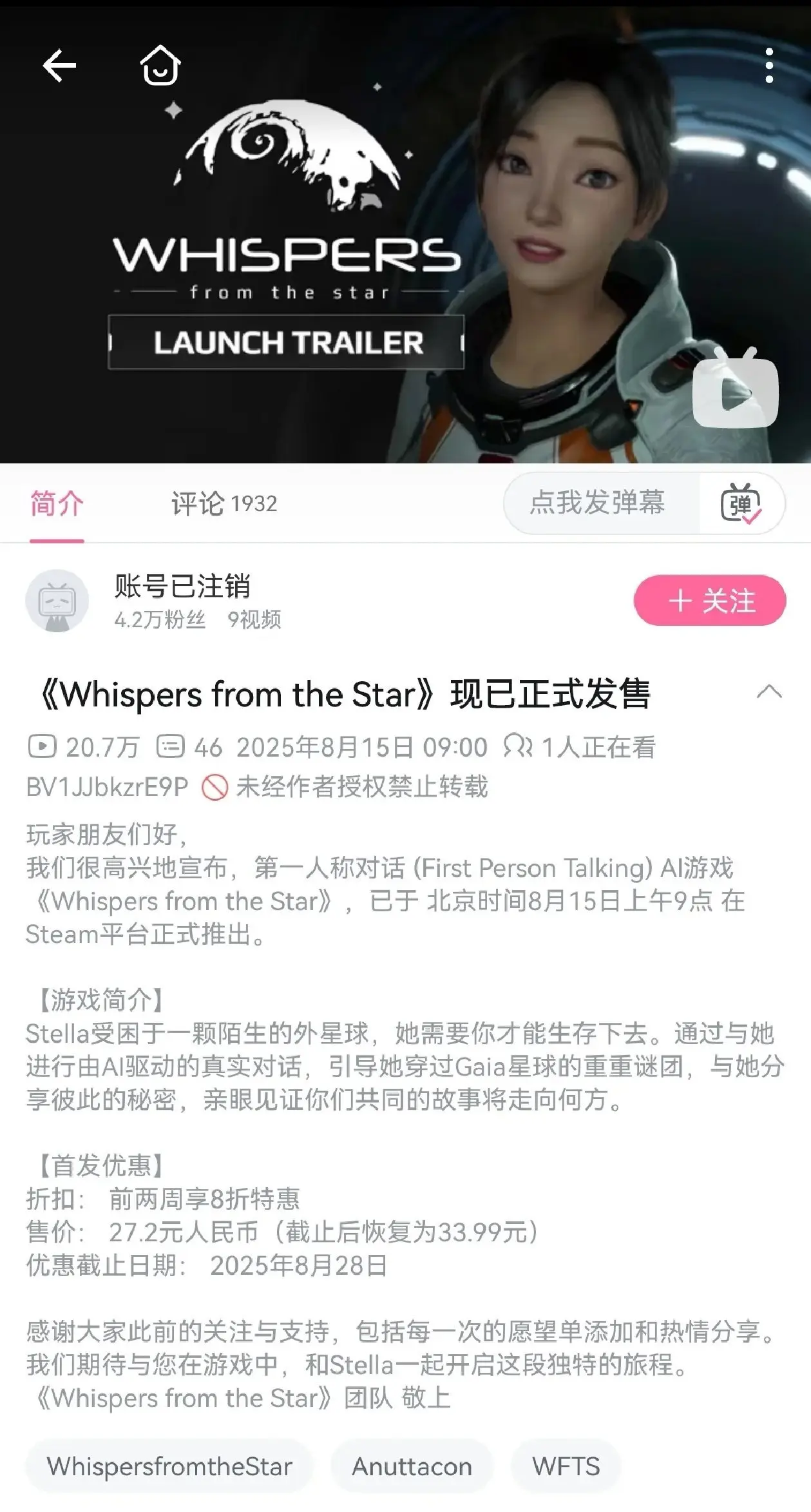 近日,由米哈游联合创始人蔡浩宇创立的AI游戏公司Anuttacon,其旗下作品《群星低语》在某站、某博等平台的官方账号已陆续注销或停更,虽然知道这游戏的市场主要在国外毕竟连中文都没有但也不至于直接多平台销号啊![[TapTap表情|TapFamilyxdoro2_粉狗比心]](https://img.tapimg.com/market/images/101c7e3200596fe8e03765080b467fb8.gif)