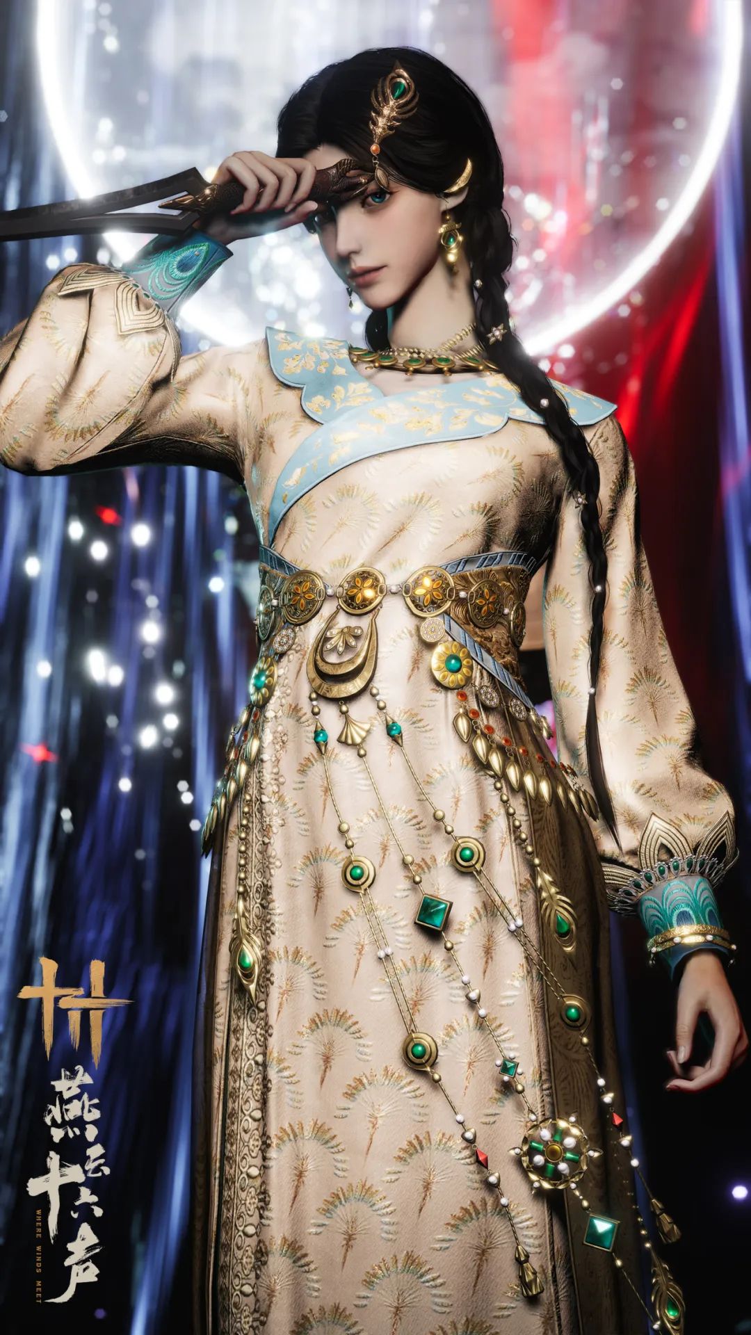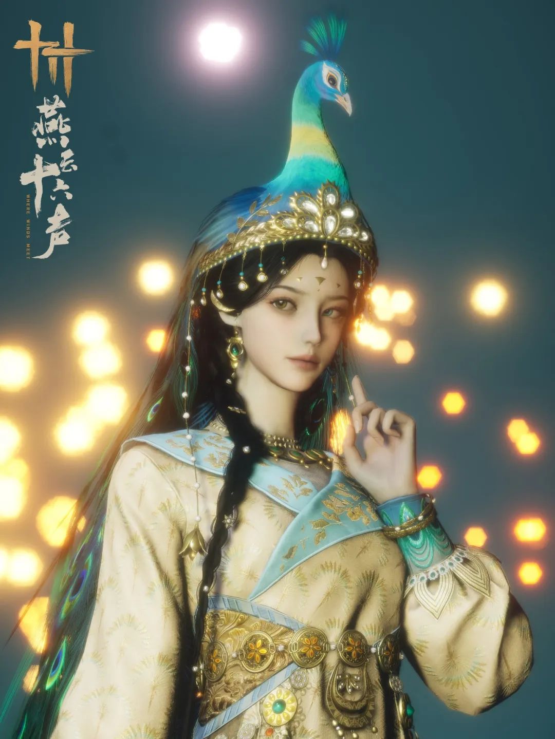 此衣绣满孔雀翎纹,配饰轻摇间翠影流转,既荡漾着独特的异域风韵,又显出几分神秘气息。在翎羽流光中,忆起故城的月色与酒香,似乎又听见了故园的歌谣,重逢了葡萄架下的晚风。有时凭借一方风物,也能寄予悠悠乡愁。