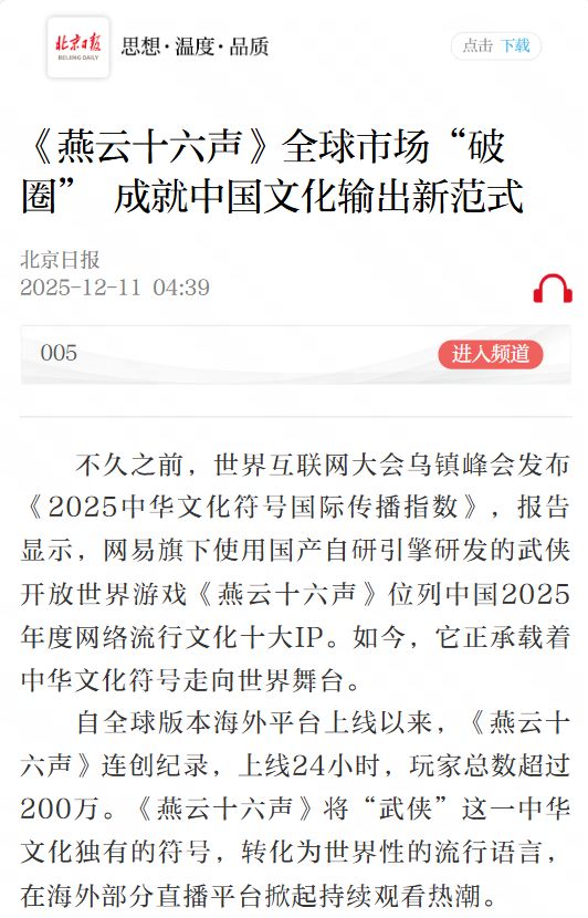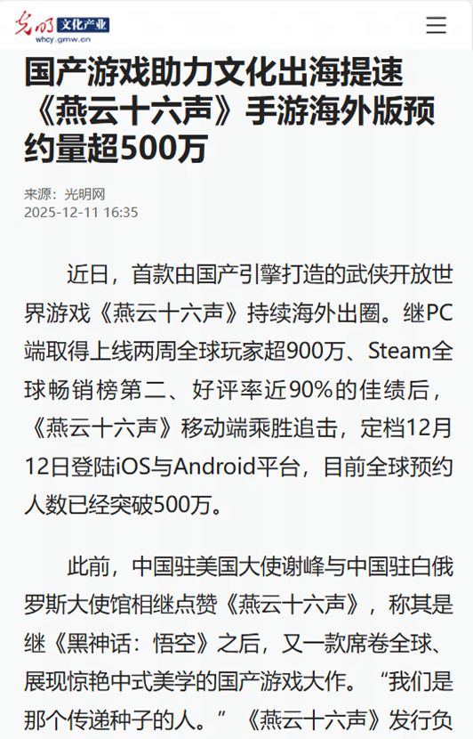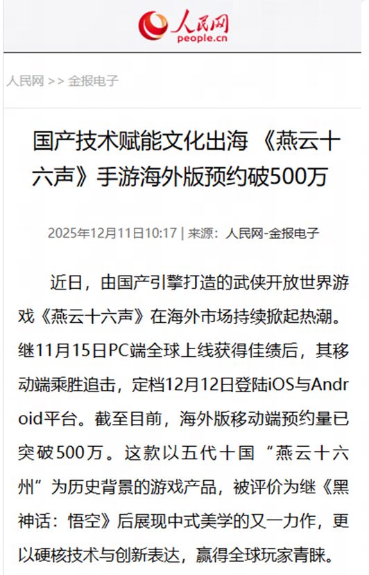 此番出海之路,我们也有幸获得了新华社、人民日报、人民网、光明网、北京日报等多家权威媒体的报道,得以将燕云的江湖来路分享给更多朋友。其中新华网的专访,也得到了新华社、中国青年网等媒体转载。