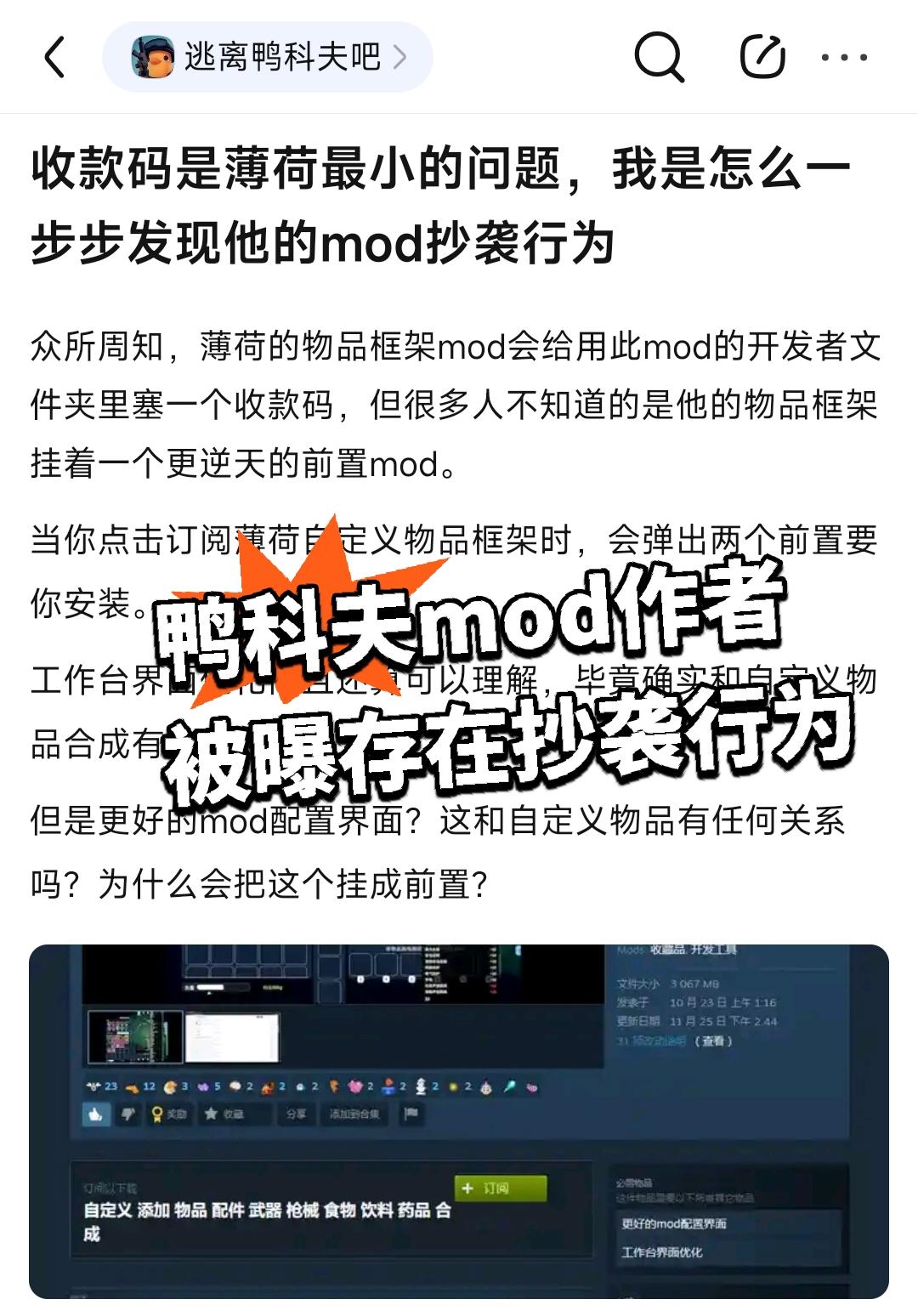 鸭科夫mod作者被曝存在抄袭行为
