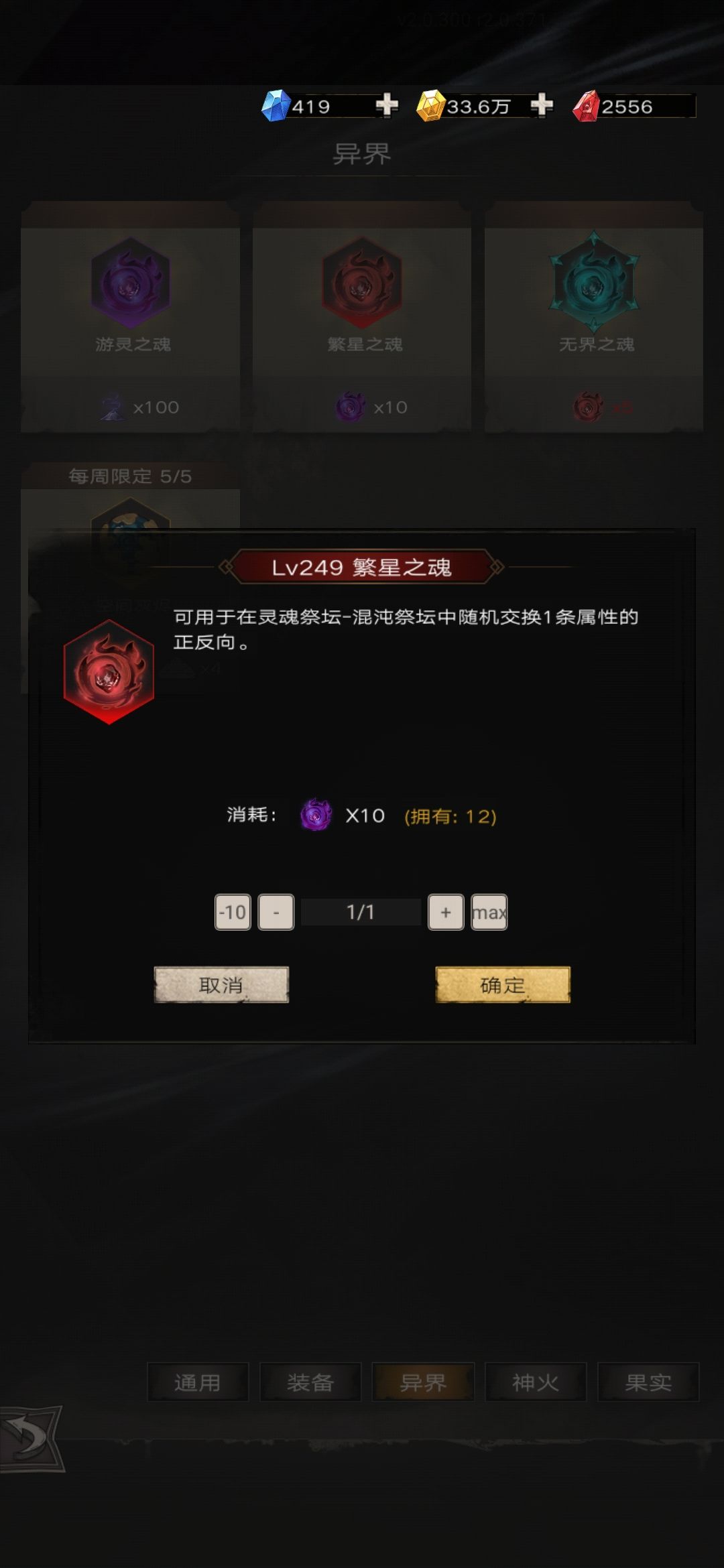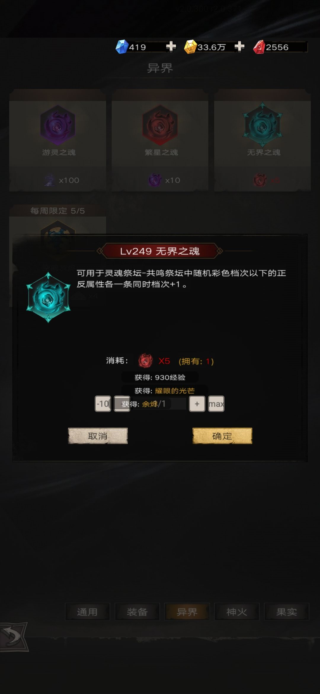 2.基础材料:灰烬,在通过世界201后挂机获得,灰烬可以直接在兑换中的异界一栏兑换游灵、繁星、无界三种灵魂以及空间灰烬(使用后刷新灵魂祭坛)