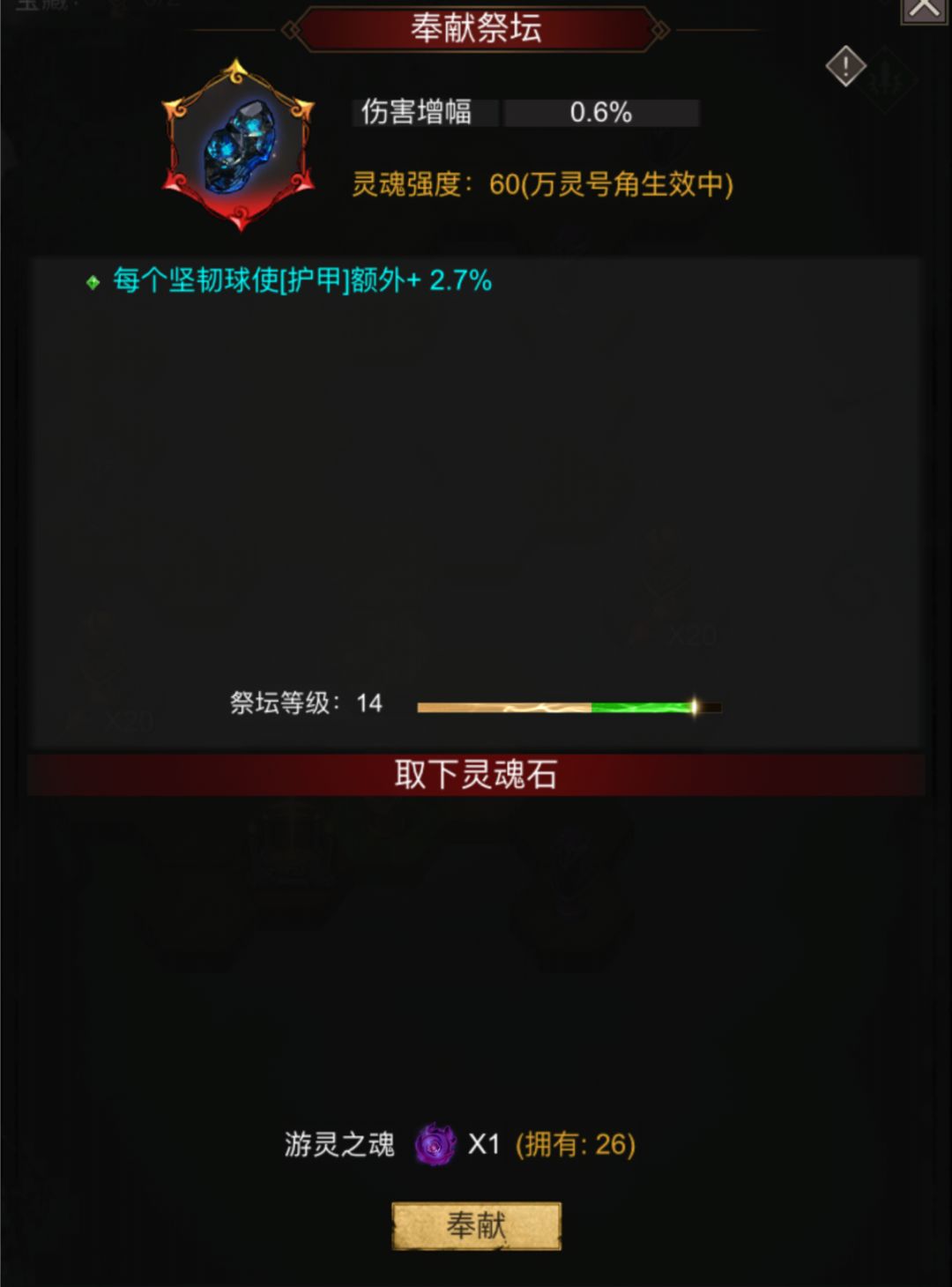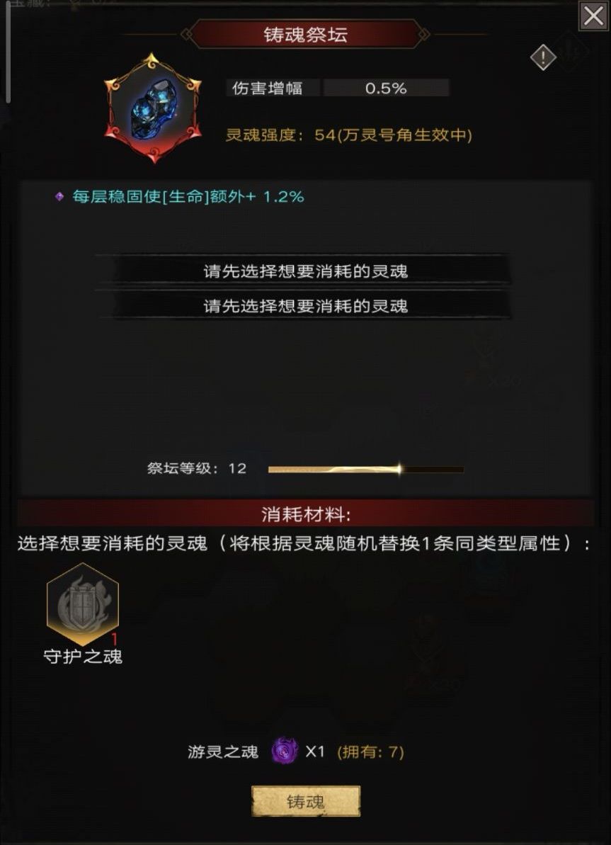 4.祭坛等级:在任意祭坛界面中可以看到,经验条满了后通过消耗灵魂及灰烬升级,升级可提升获取的灵魂石灵魂强度及高级灵魂掉落概率