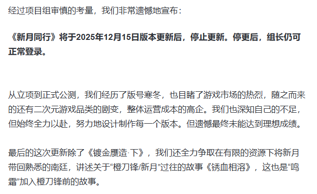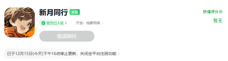 12月15日,《新月同行》在上线417天后,宣布游戏将于今日版更后停止更新。同时,游戏也已在App Store、好游快爆、B站等渠道下架。停更过后,玩家仍可正常登录游戏。
