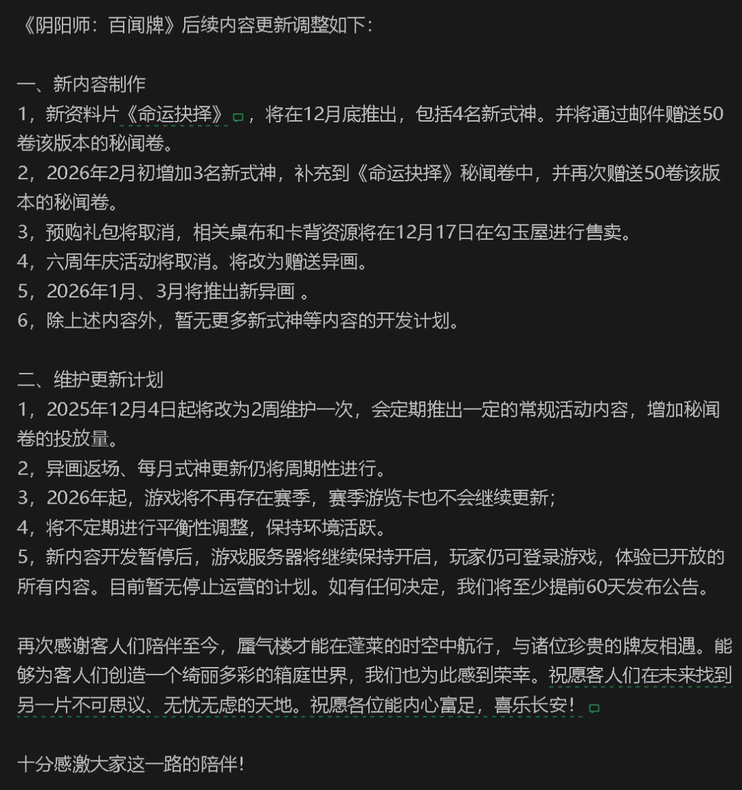 但也有少部分产品,会选择相对体面一些的死法。比如《阴阳师百闻牌》实际上并没有停运,只是取消了大部分新内容的开发,停止赛季制和大型活动投放;《新月同行》同样是停止更新,官方还计划在最后一次更新中完成一个大版本、补全一些剧情内容,放到所有走向停更/停服的游戏里,这么做也算有是诚意了。