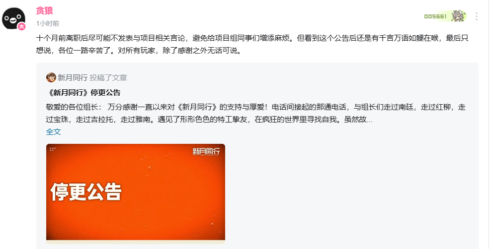 如今,面对游戏的停更公告,他表示“千言万语如鲠在喉,最后只想说:各位一路辛苦了。”