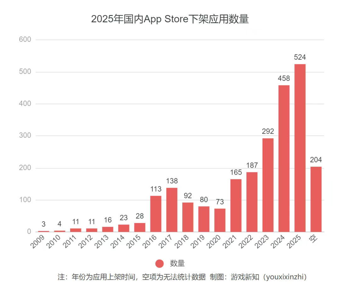 这些有头有脸,能风光大葬的产品,还只是极小一部分。更多产品都是默默地走了,正如它默默地来——据游戏新知统计,截至2025年11月25日,今年国内App Store年内共下架了2222款应用。其中,有27.56%的产品连一年都没活过。