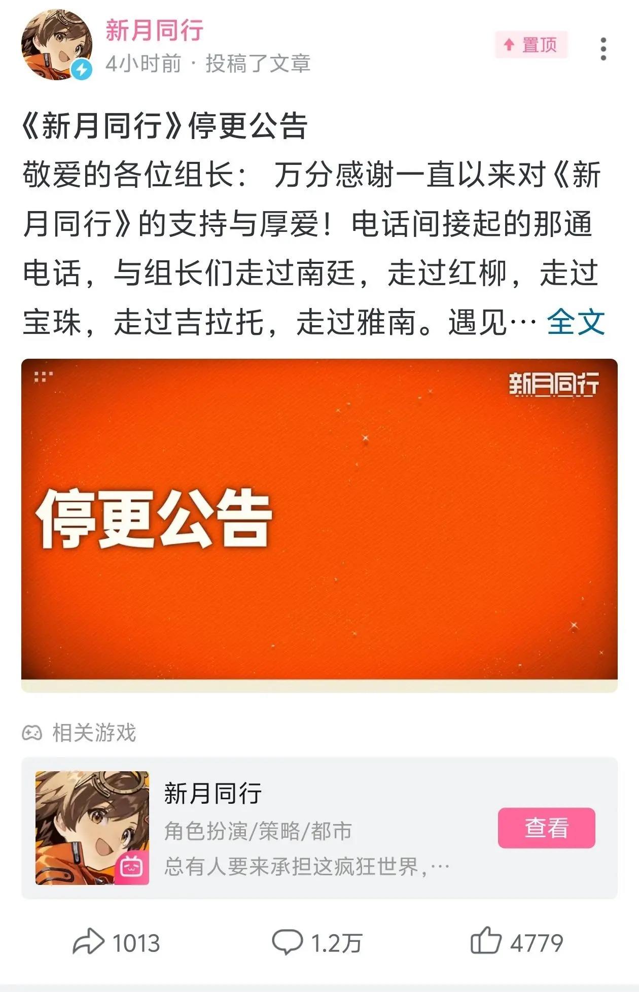 刚过完一周年就官宣停更,《新月同行》这波操作确实让人懵——从公测到落幕才417天,连主笔白伯欢都感慨“千言万语如鲠在喉”。