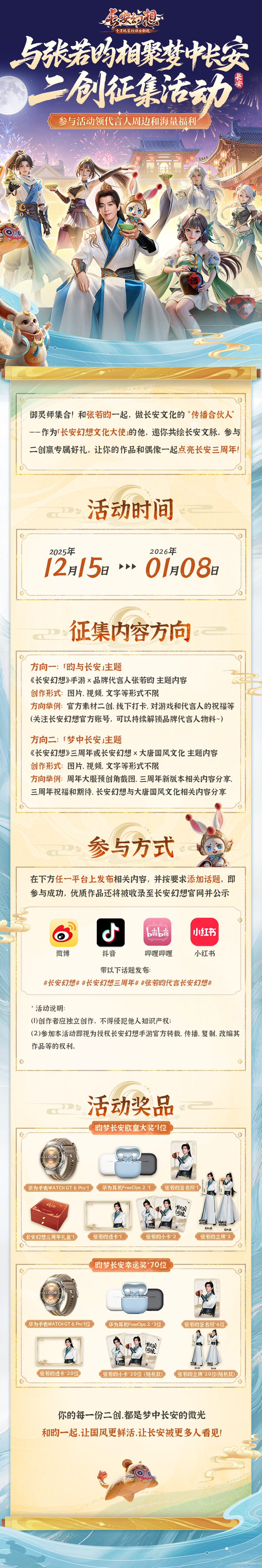 【昀梦长安二创征集活动】:参与二创征集活动,有机会获得张若昀签名照、张若昀长安幻想周边(立牌&小卡&透卡)、长安幻想三周年纪念礼盒、华为手表WATCH GT 6 Pro、华为耳机FreeClip2等豪礼!