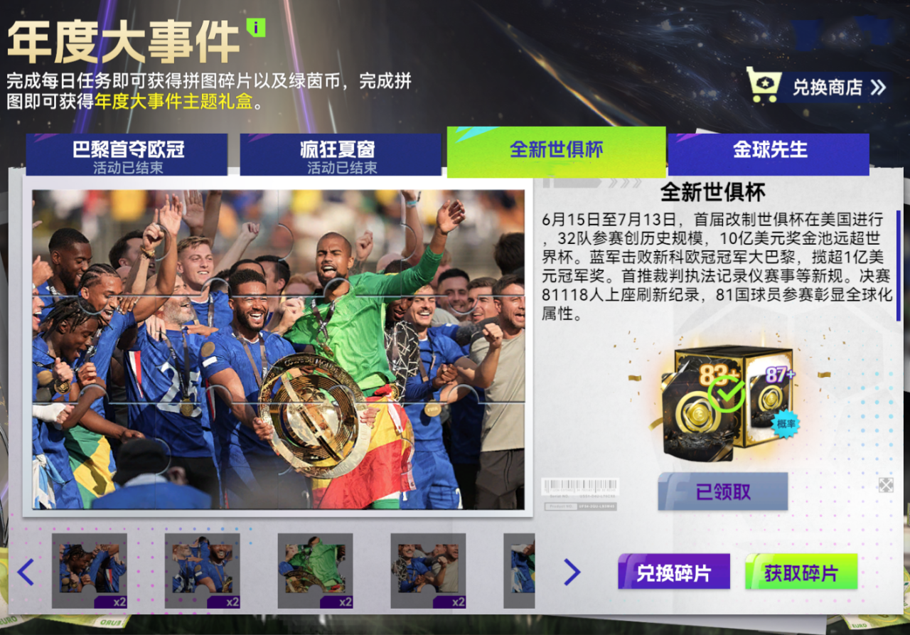 完成每日任务即可获得拼图碎片以及绿茵币,完成拼图即可获得世俱杯混合球员礼盒,最高可获得【87+】球员包。改制后的首届世俱杯是一次全新意义上的“世界级大赛”。32支顶级俱乐部齐聚,参赛规模与奖金体量均创历史新高。参与活动,重温这场震撼足坛的全新盛宴,集齐拼图就有机会把属于世界冠军级别的力量,带回你的阵中!