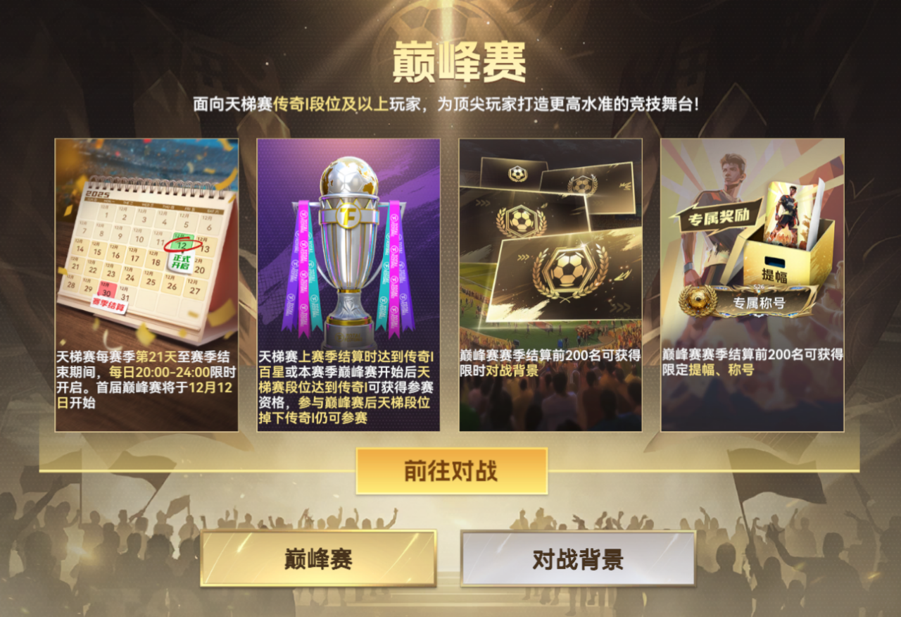 全新“巅峰赛”玩法重磅登场,专为天梯赛传奇段位及以上的玩家打造的更高水准的竞技舞台!首届巅峰赛将于12月12日正式开始,每日20:00-24:00限时开启。巅峰赛是为真正强者准备的舞台。这里汇聚的是渴望挑战、强强对话的主帅——用实力说话,用胜利回应质疑,一步步向更高层级迈进,巅峰赛等你来战!
