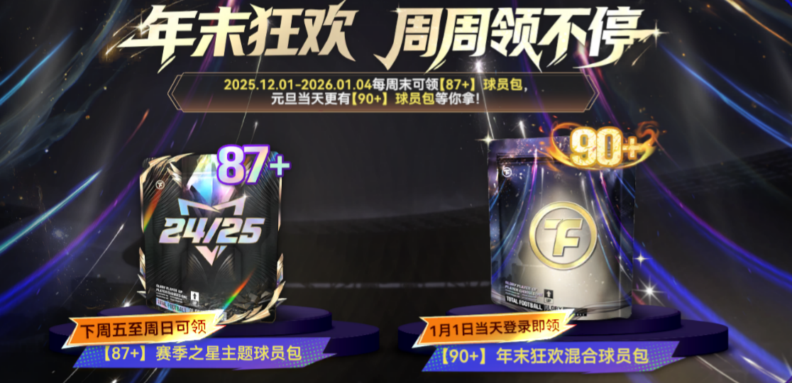 2025.12.01-2026.01.04每周末可领【87+】球员包,元旦当天更有【90+】球员包等你拿!每一个周末,都会有稳定而丰厚的回馈;而跨年当天,更是年末福利的顶点时刻。持续参与、持续收获,让你的阵容在辞旧迎新之际,完成真正意义上的全面战力升级!
