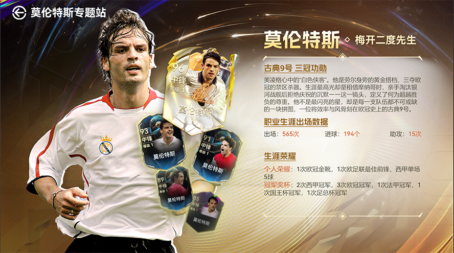 回顾莫伦特斯波澜壮阔的职业生涯,参与活动完成挑战关卡最高可兑换【85+】梅开二度先生主题球员。冠军的得来从来不是偶然。在一场又一场高强度对抗中莫伦特斯始终站在最关键的位置,用进球回应压力,用表现证明价值。完成挑战,重走这条通往荣誉的道路,就有机会让这位屡屡在大赛中挺身而出的中锋,加入各位主帅的阵容。