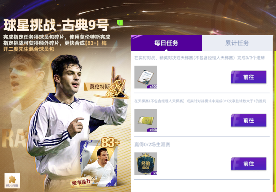 完成指定任务得球员包碎片,使用莫伦特斯完成指定挑战可获得额外碎片,更快合成【83+】梅开二度先生混合球员包。“古典9号”,是最纯粹的中锋定义。 他们不追逐花哨,而是用站位、对抗和门前嗅觉决定比赛走向。莫伦特斯正是这类中锋的典范,精准的抢点和在禁区内几乎不讲道理的终结效率,让他成为门前威胁最大的锋线杀手。参与活动就有机会将这位“梅开二度”先生带回你的阵中!