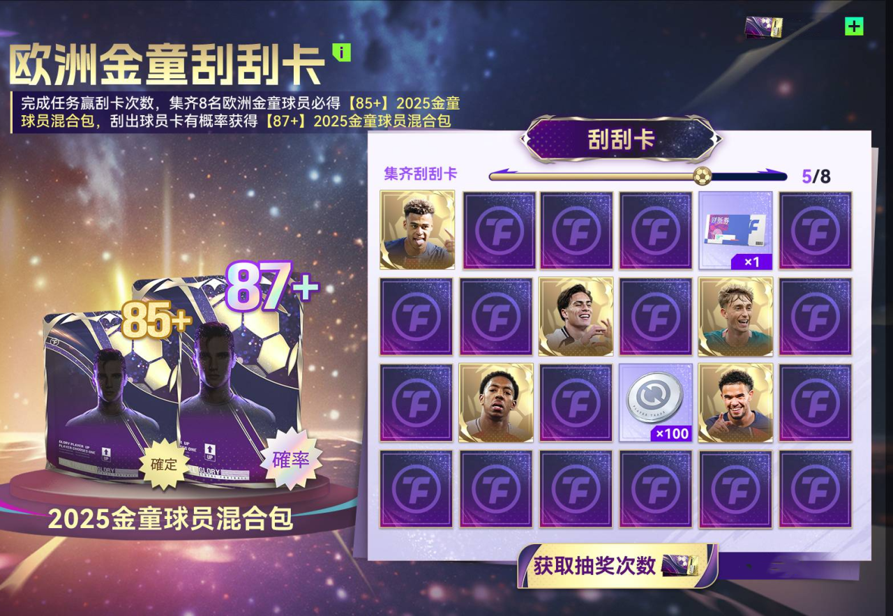 完成任务赢刮卡次数,集齐8名欧洲金童球员必得【85+】2025金童球员混合包,刮出球员卡概率获得【87+】2025金童球员混合包。这是关于未来足坛的所有期待,每一次刮开,都是一次潜力的释放;每一位金童,都是足坛下一个时代的答案。提前布局新生代力量,让你的阵容,不只赢在当下,更领先于未来。