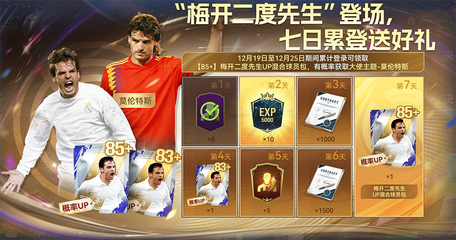 12月19日至12月25日期间累计登录可领取【85+】梅开二度先生混合球员包,有概率获取大使主题-莫伦特斯 。连续七日登录,好礼福利送不停。坚持登录就有机会把那位在比赛中屡屡上演“梅开二度”,在关键时刻用进球改写胜负的“白衣骑士”召入你的阵中。