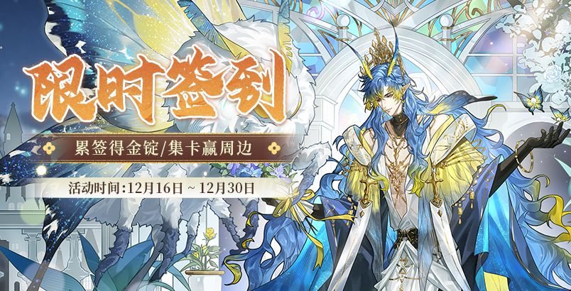 主上,12月限时签到现已开启,累签7天即可获得全部道具奖励,参与集卡还有机会获得随机周边哦~