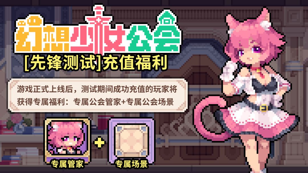 A:本次测试期间,成功充值的玩家将会在游戏正式上线后获得:专属管家皮肤+公会场景。