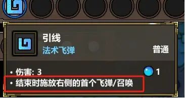 结束时释放右侧首个飞弹/召唤,顾名思义,如果我们将法术以下图方式排列,那么释放顺序将不会是发出引线,然后放出克总之心。而是直接耗蓝51(引线的1+克总之心的50)先发射引线,引线在结束后,会在结束位置释放克总之心。