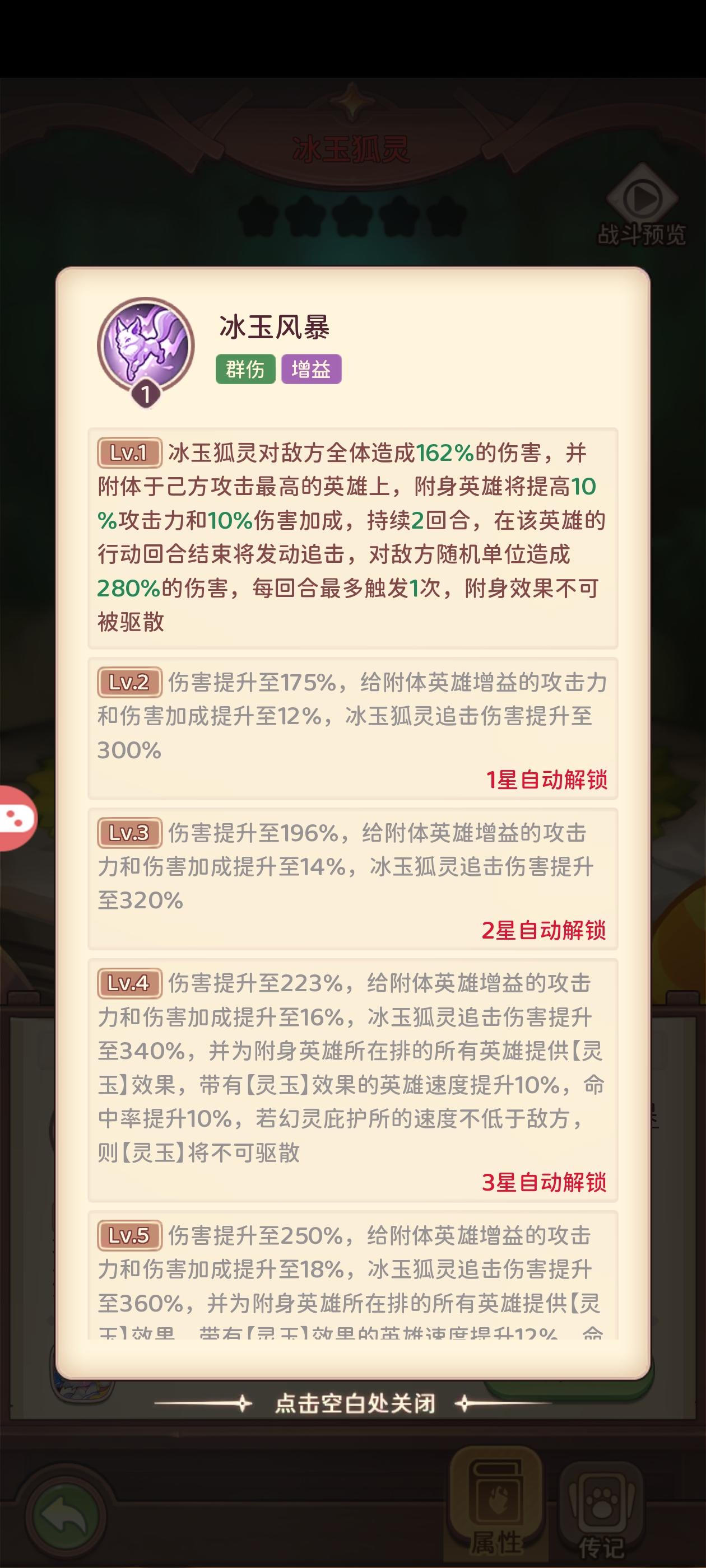 冰玉狐灵:全伤,增益,3星之后增益一排,3星之后,阵容站位就是123或者141站位了,1星增伤效果不错,3星增益一排,值得3星,4,5星成长太小不值得