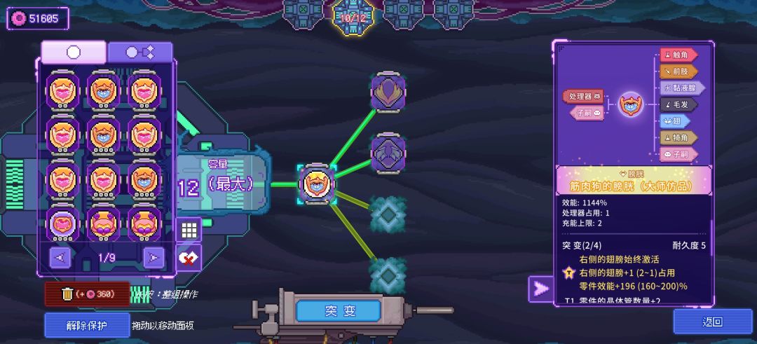 6.在你给零件突变的时候,右边的紫框的左下角有一本书样的按钮,那是你能刷出来的词条库