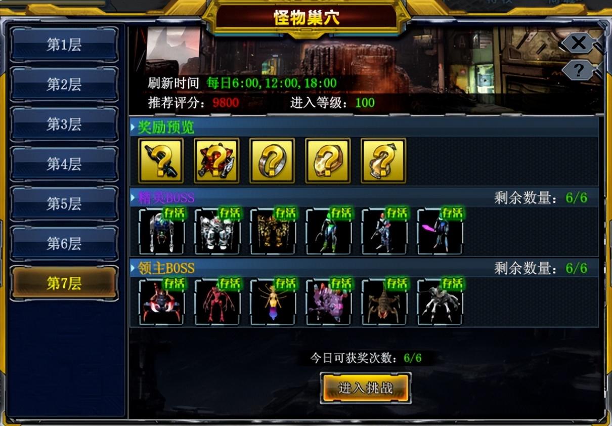 作为游戏中最靠谱的装备来源,怪物巢穴每日6次挑战机会堪称"神装保底"。不同层级巢穴对应不同等级装备,从优良级到高品阶全覆盖,建议萌新优先冲击自身能通关的最高难度,收益直接拉满 !每日清空次数不浪费,轻松囤积基础装备与强化材料,为前期发育筑牢根基。