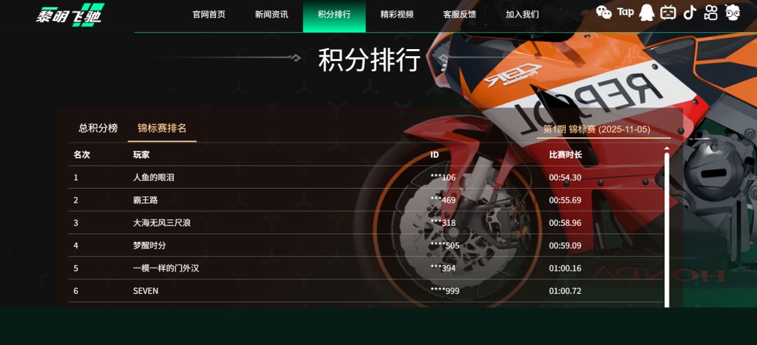 《黎明飞驰》官网锦标赛排行榜功能正式上线!严格遵循官网设定,「总积分榜」与「锦标赛排行」两大核心榜单同步开放查询,覆盖车手全周期竞速表现 ——