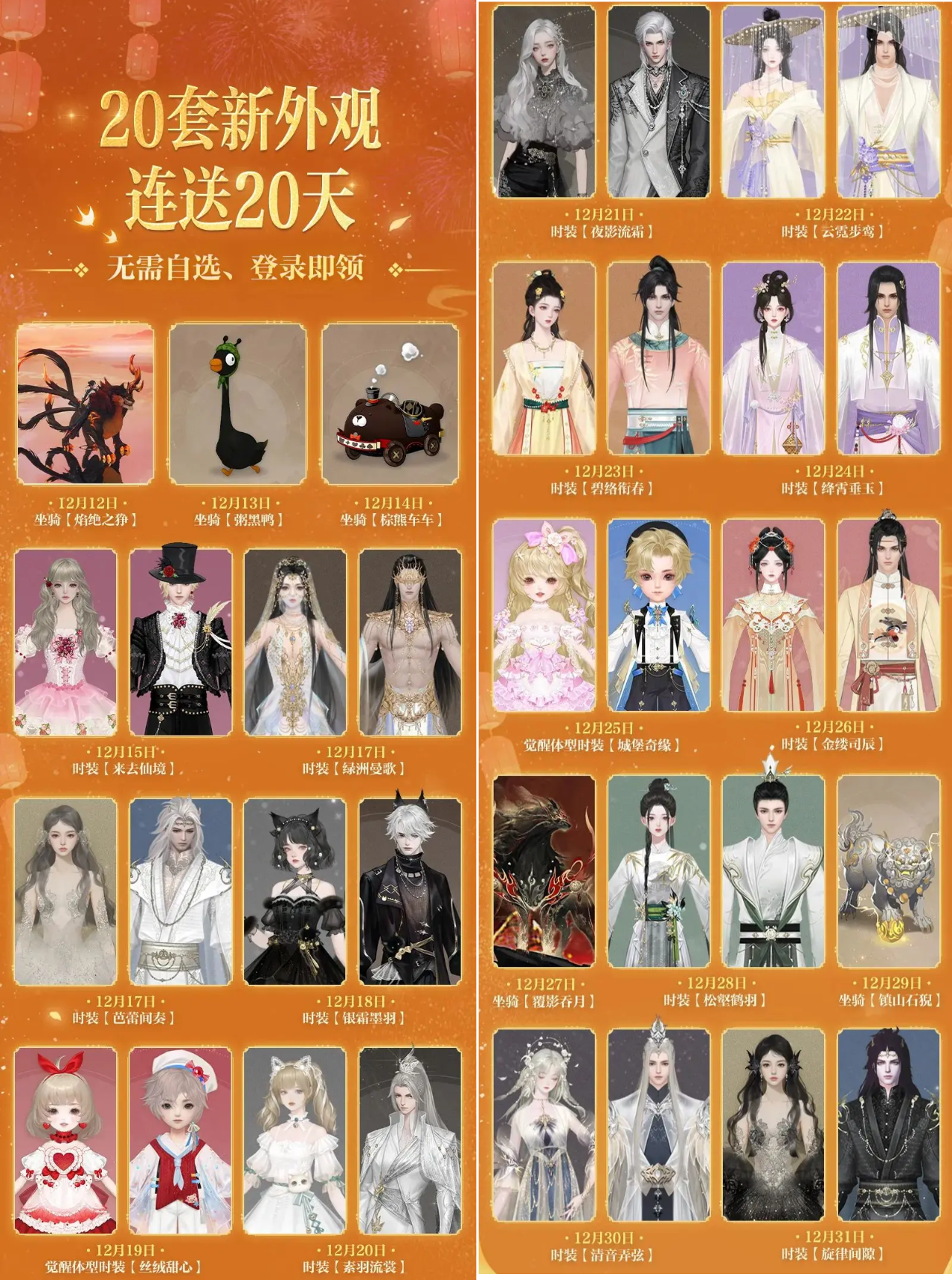 2.无需自选、登录即领20套新外观:12 月 12 日 - 12 月 31 日,登录就能直接领取 20 套全新外观时装、坐骑、觉醒体型时装应有尽有!