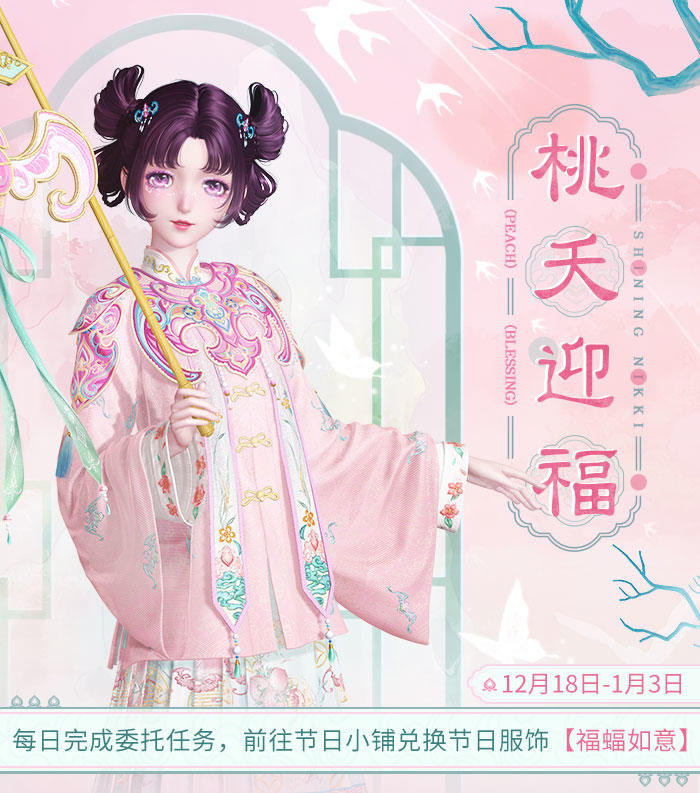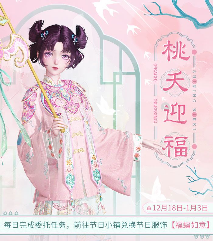 12月18日更新后,活动期间内,每日拜访设计师并完成委托任务,即可获得节庆之章,消耗节庆之章可兑换免费稀有服饰【福蝠如意】!